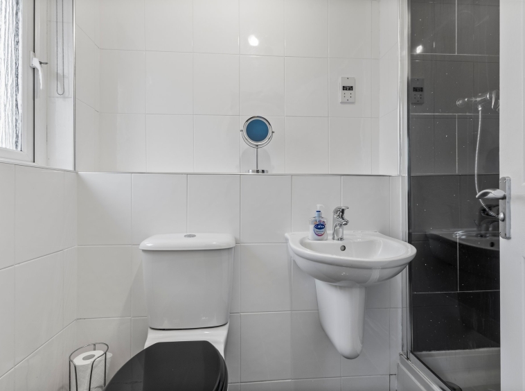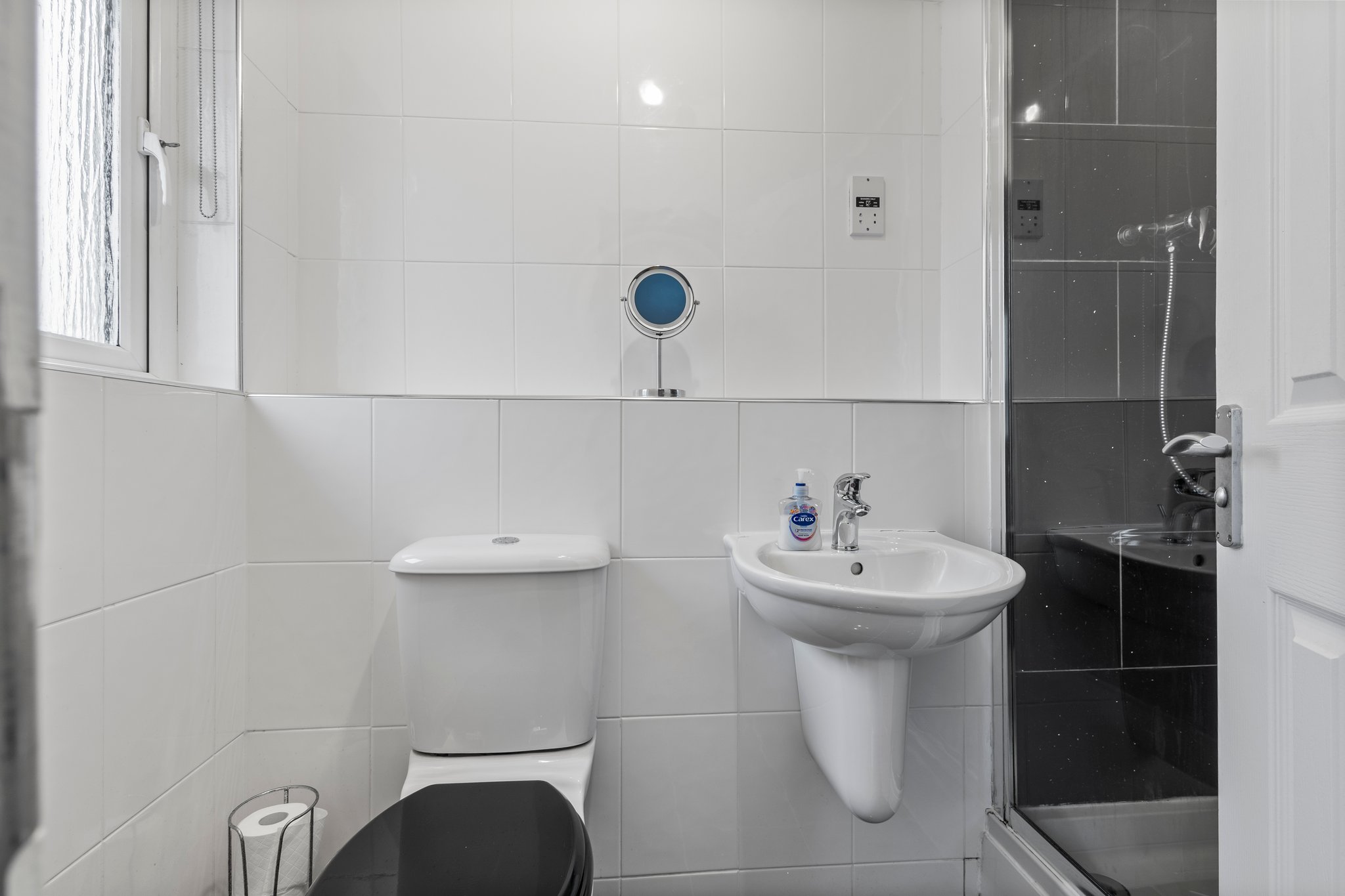 1.2m x 2.44m (3′ 11″ x 8′ 0″) Three piece ensuite shower room featuring WC, wash hand basin, mains shower cubicle, crisp white tiles with contrasting anthracite tiled shower cubicle and opaque double glazed window to the rear.