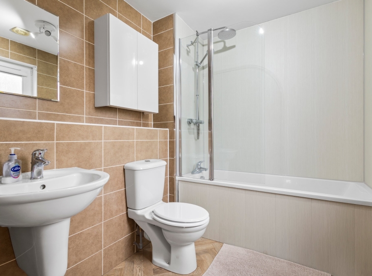 1.82m x 2.44m (6′ 0″ x 8′ 0″) Master bathroom comprising of WC, wash hand basin, mains shower over bath, neutral tiles to the wall, wet wall finish around the bath, herringbone vinyl flooring and opaque double glazed window to the side.