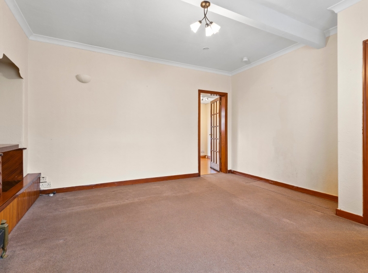 4.43m x 4.39m (14′ 6″ x 14′ 5″) Generous main apartment, featuring neutral decor, ceiling coving, feature fireplace, door access to the dining area and kitchen, double glazed window to the front.