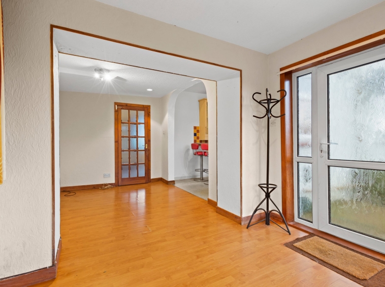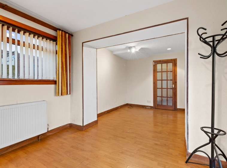 2.51m x 2.92m (8′ 3″ x 9′ 7″) Flexible space off of the kitchen which could be used as a dining area, featuring neutral decor, laminate flooring and open plan access to the kitchen and sitting room.