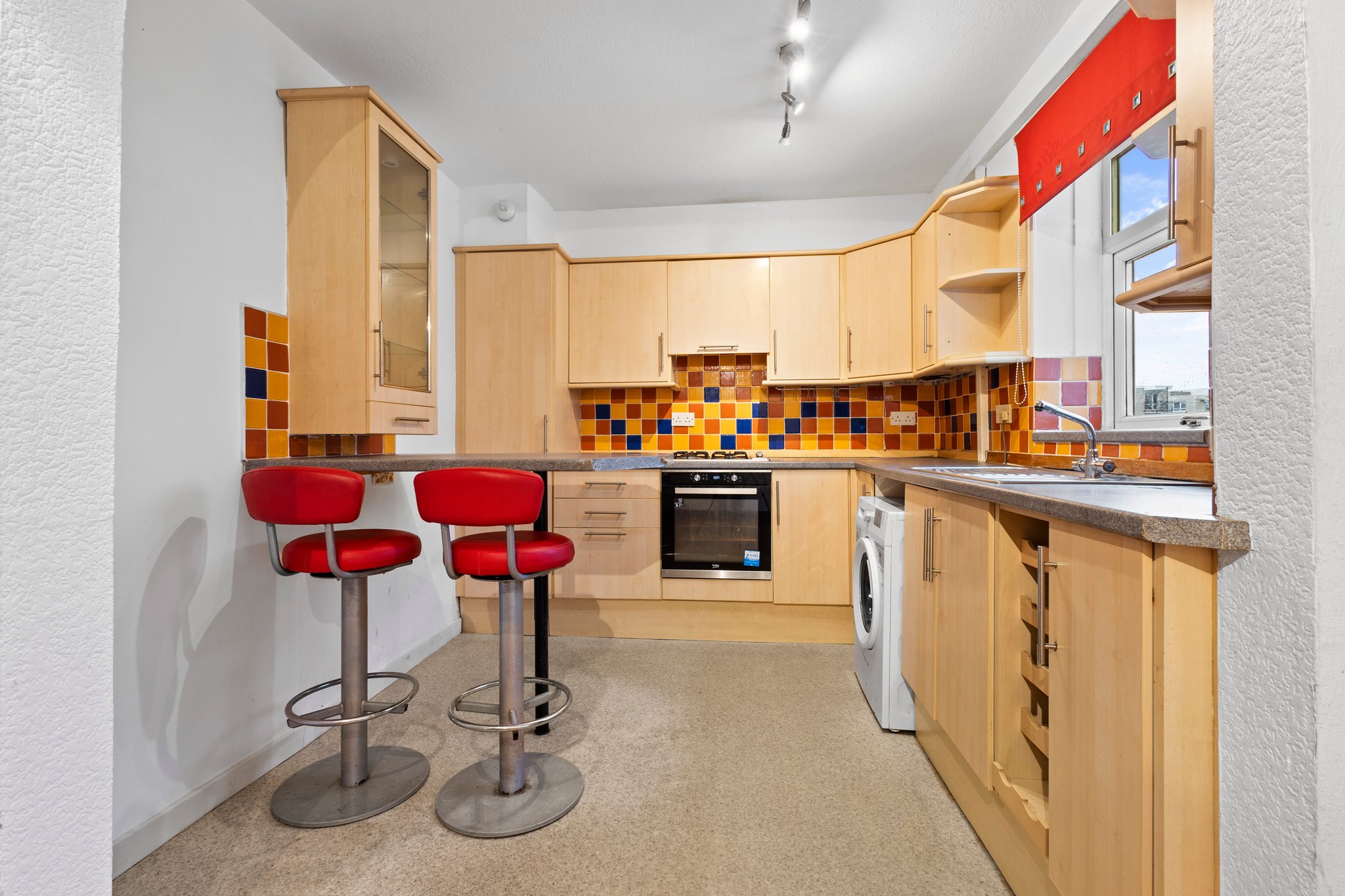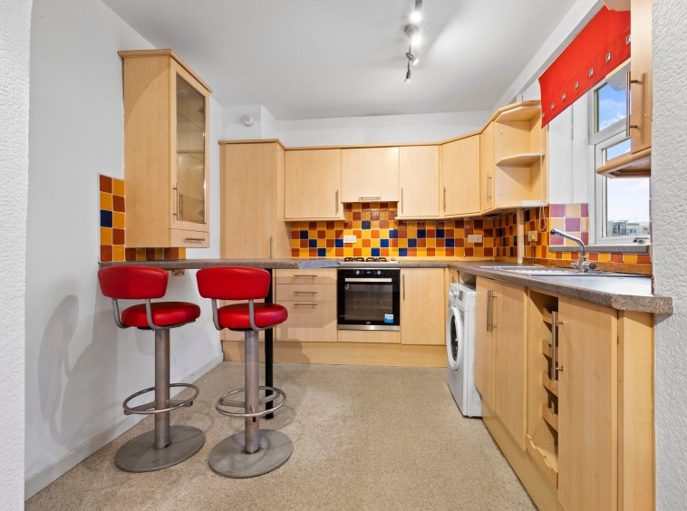 2.98m x 2.82m (9′ 9″ x 9′ 3″) Fully fitted kitchen offering an array of wall and base units, contrasting work surfaces, tiled splashback, integrated gas hob, electric oven, plumbing space for a washing machine, stainless steel sink and drainer, breakfast bar, vinyl flooring and double glazed window to the rear.