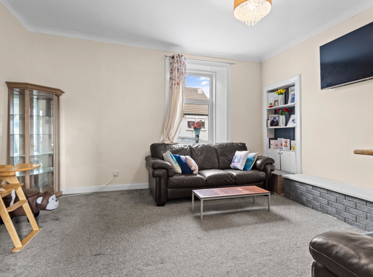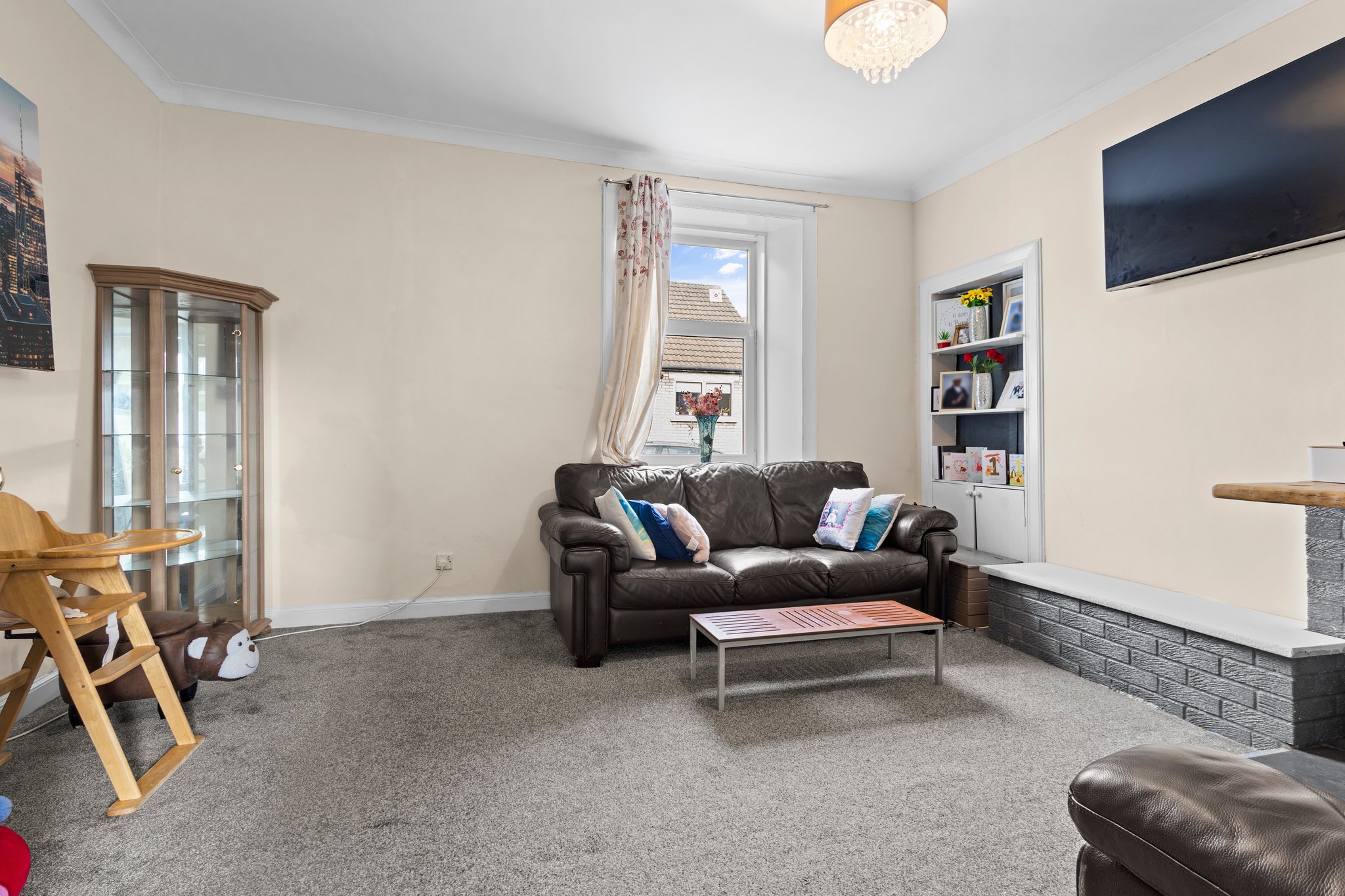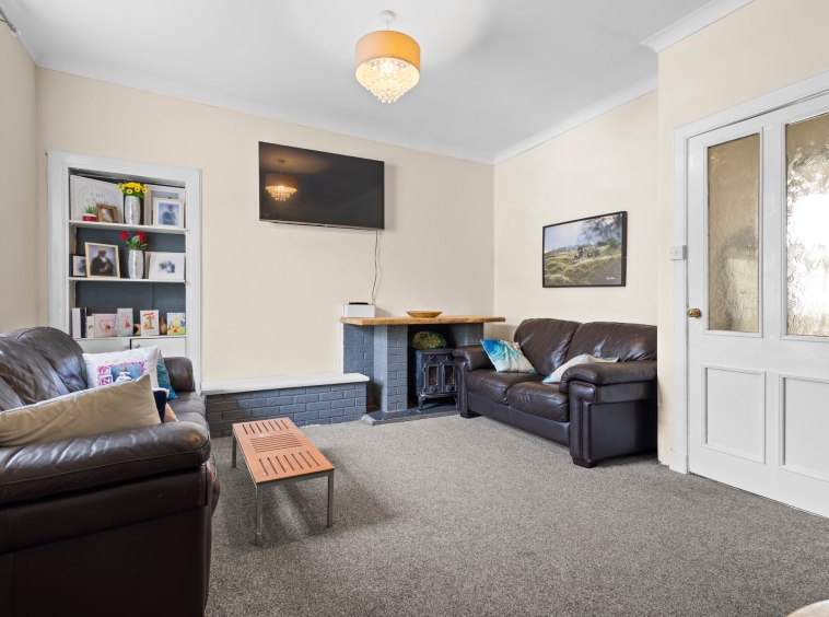 4.74m x 4.34m (15′ 7″ x 14′ 3″) Generously proportioned main apartment boasting neutral décor, ceiling coving, feature log burning stove set within a brick surround, fitted carpet and a double glazed window to the front.