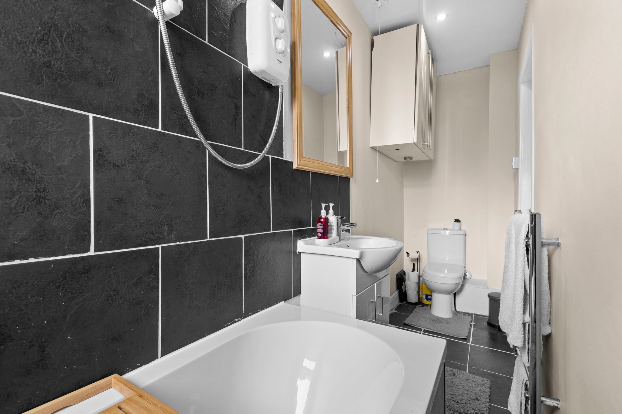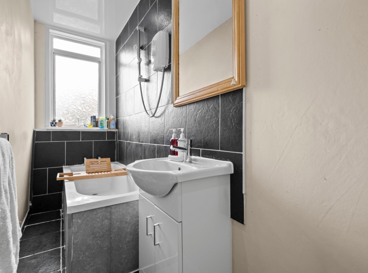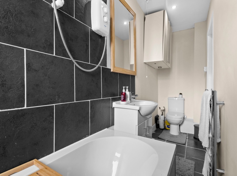 1.05m x 3.99m (3′ 5″ x 13′ 1″) Three piece fitted bathroom consisting of WC, wash hand basin, electric shower over bath, neutral decor with contrasting anthracite tiles around the bath, tiled floor and double glazed opaque window to the rear.