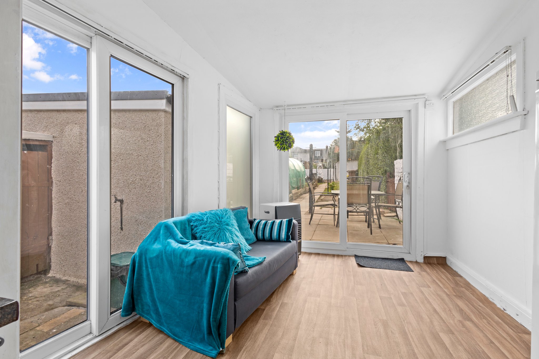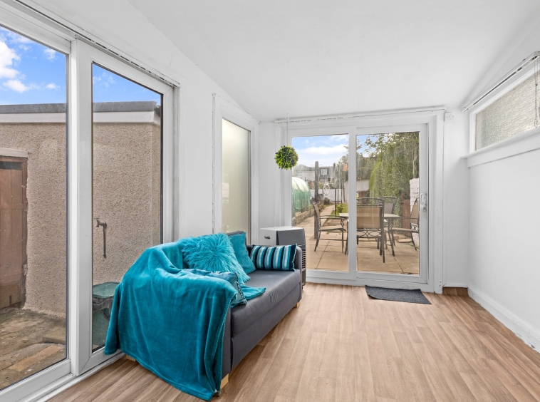 2.42m x 2.90m (7′ 11″ x 9′ 6″) A bright sun room offering neutral decor, vinyl flooring and double glazed patio doors to the side and rear.