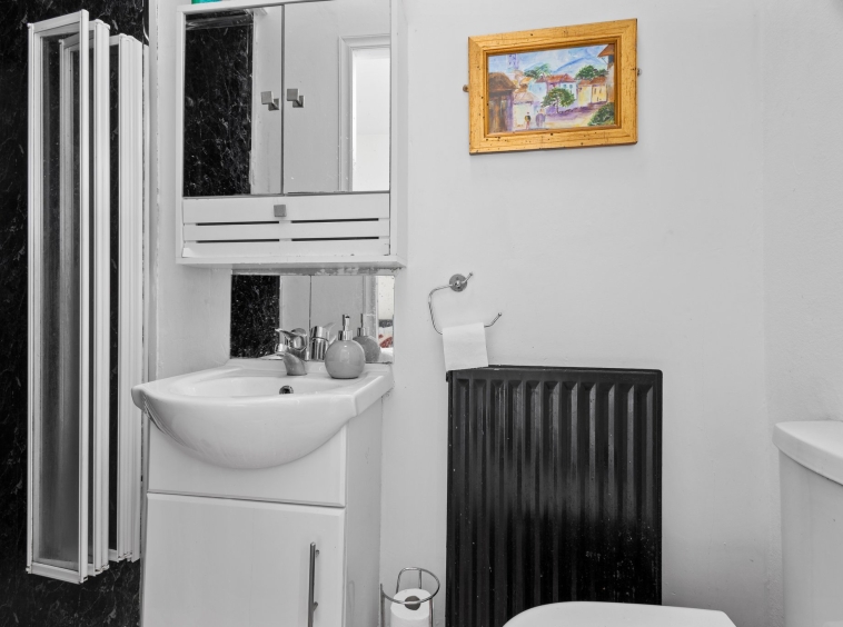 2.27m x 0.80m (7′ 5″ x 2′ 7″) Practical en-suite comprising of a wash hand basin with vanity unit, wc, shower cubicle with electric shower, wet wall finish to walls and vinyl flooring.