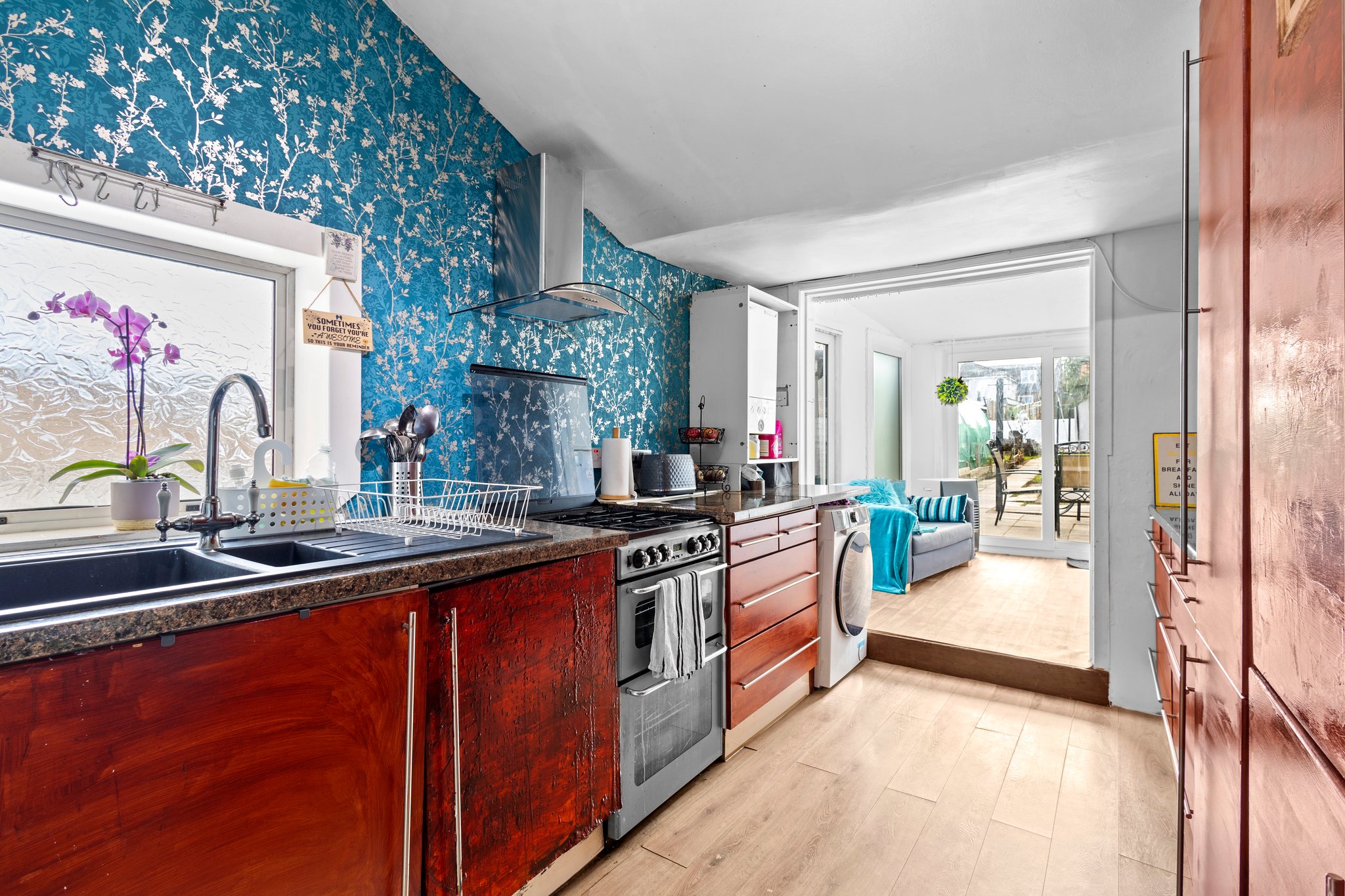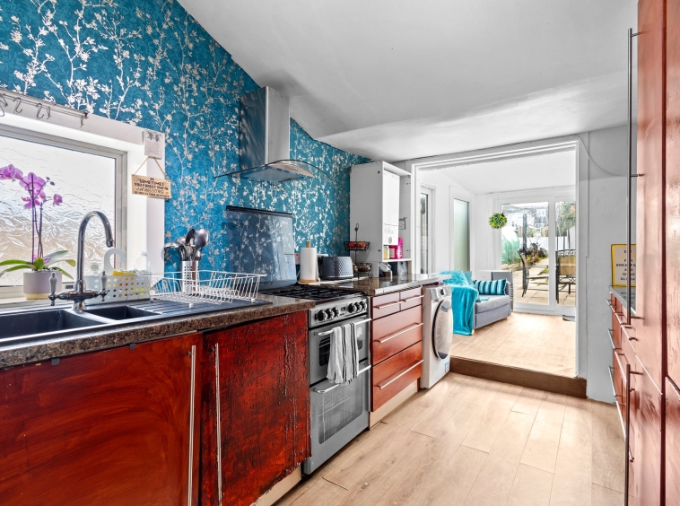 2.57m x 4.13m (8′ 5″ x 13′ 7″) Fully fitted kitchen offering an array of wall and base units, contrasting work surfaces, composite sink and drainer, space for cooker, fridge freezer and plumbing space for a washing machine, stylish decor, laminate flooring, double glazed opaque window to the side and gives access to the sun room.