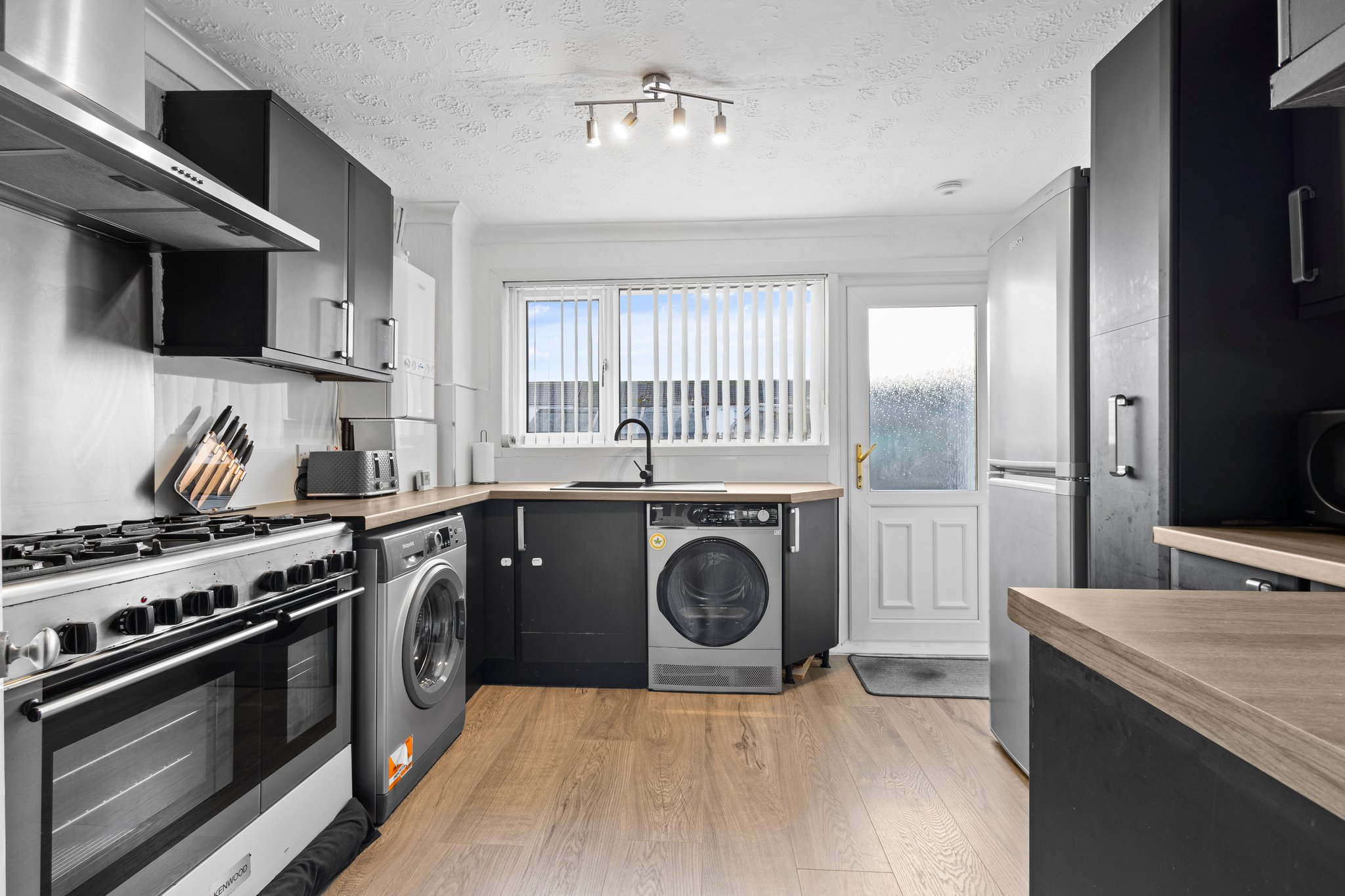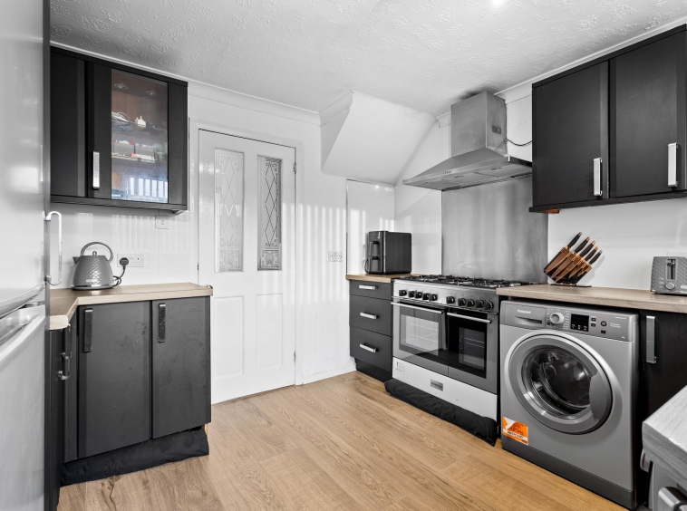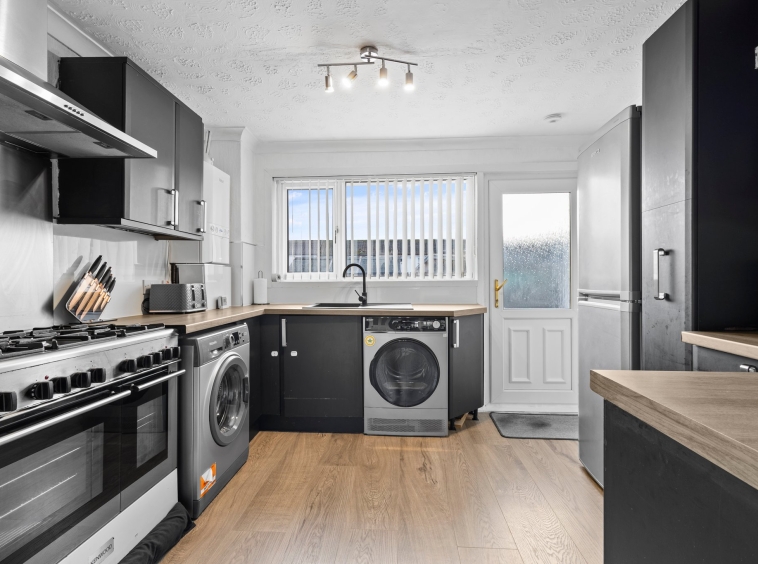 3.17m x 3.03m (10′ 5″ x 9′ 11″) Fully fitted modern kitchen complete with stylish wall and base units providing ample storage with contrasting work surface, plumbing and space for a range style cooker, fridge freezer and washing machine, sink and drainer, neutral decor, laminate flooring, a double glazed window and a door leading to the rear garden.