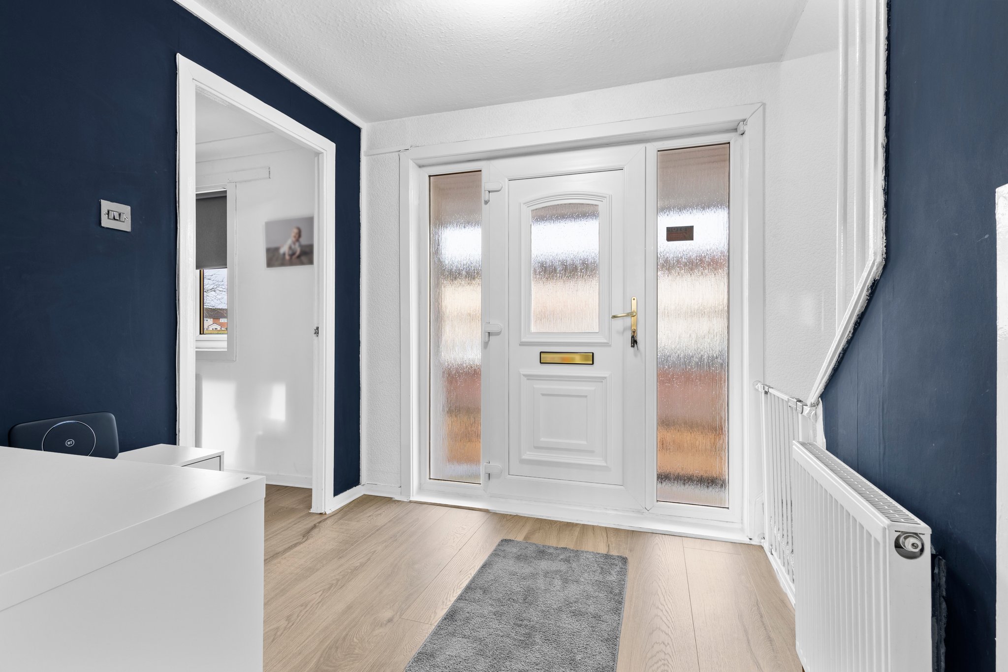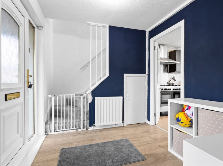 2.34m x 2.28m (7′ 8″ x 7′ 6″) Access is given to a spacious welcoming hallway boasting stylish contemporary decor and laminate flooring. Door access is given to the lounge, kitchen and a carpeted staircase leads to the upper level.