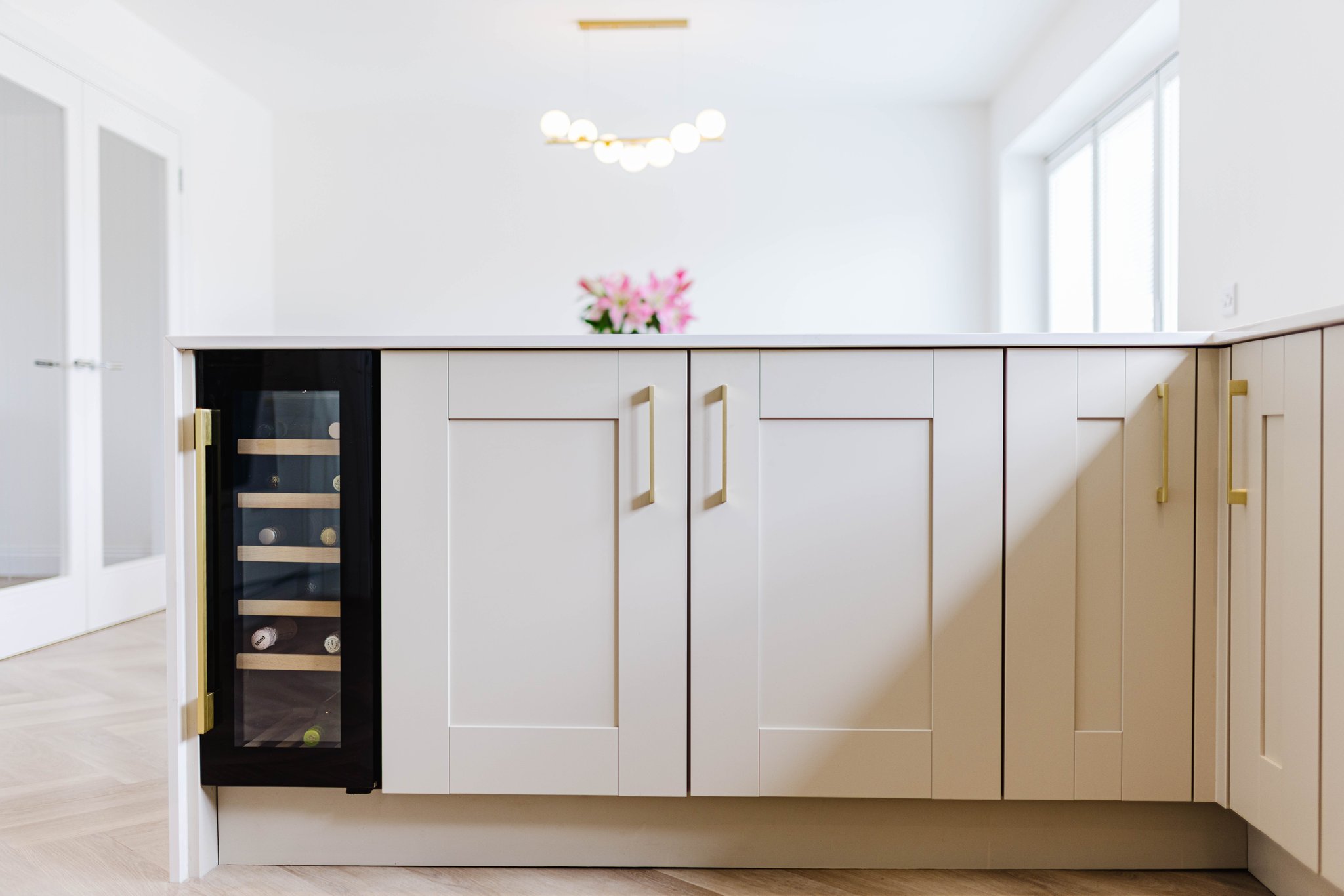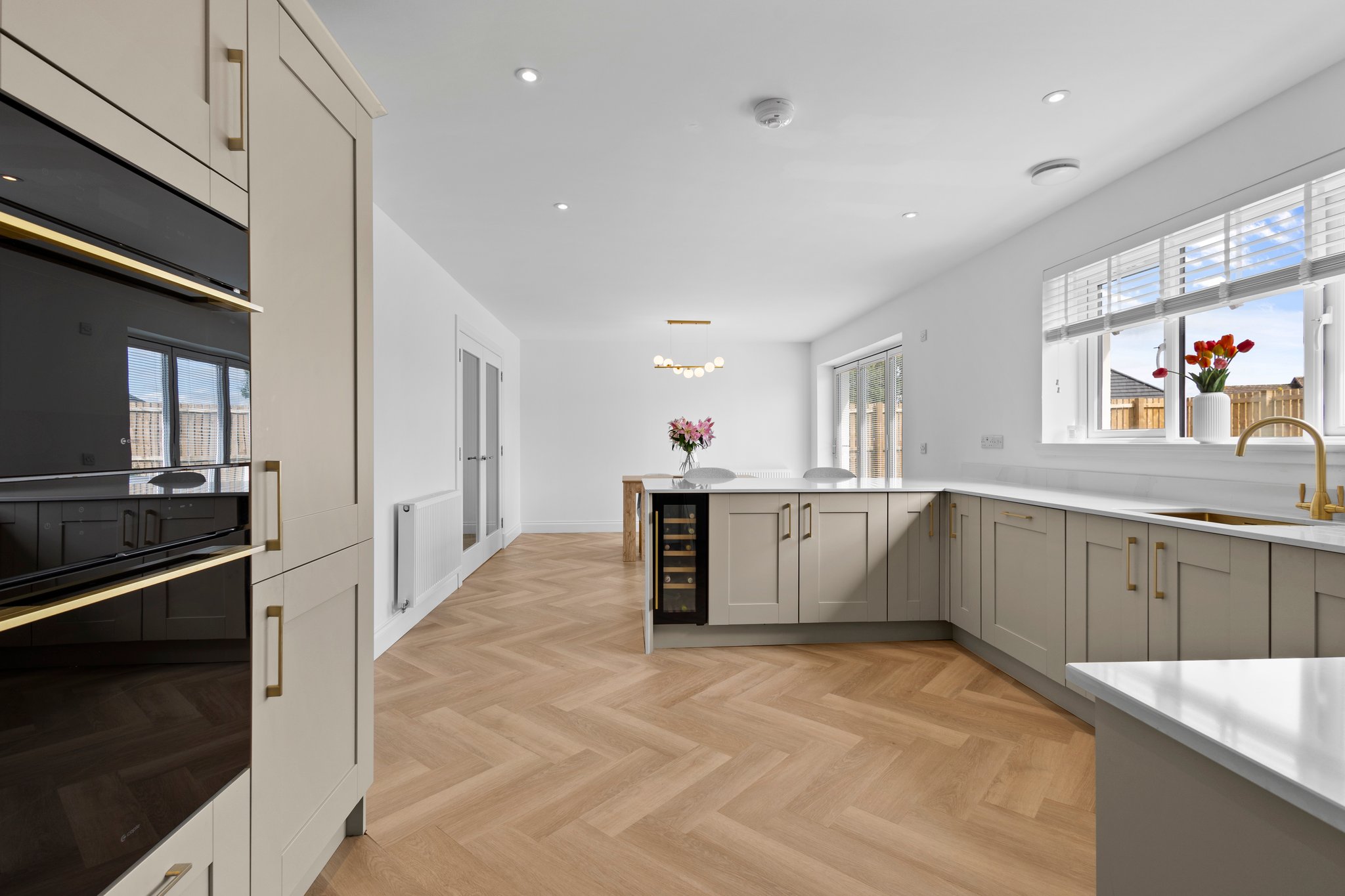 9′ 4″ x 11′ 5″ (2.84m x 3.48m) Modern fully fitted kitchen complete with integrated appliances including four zone induction hob, oven and extractor, plumbing and space for a washing machine, one and a half bowl sink with tap, practical USB charger socket.