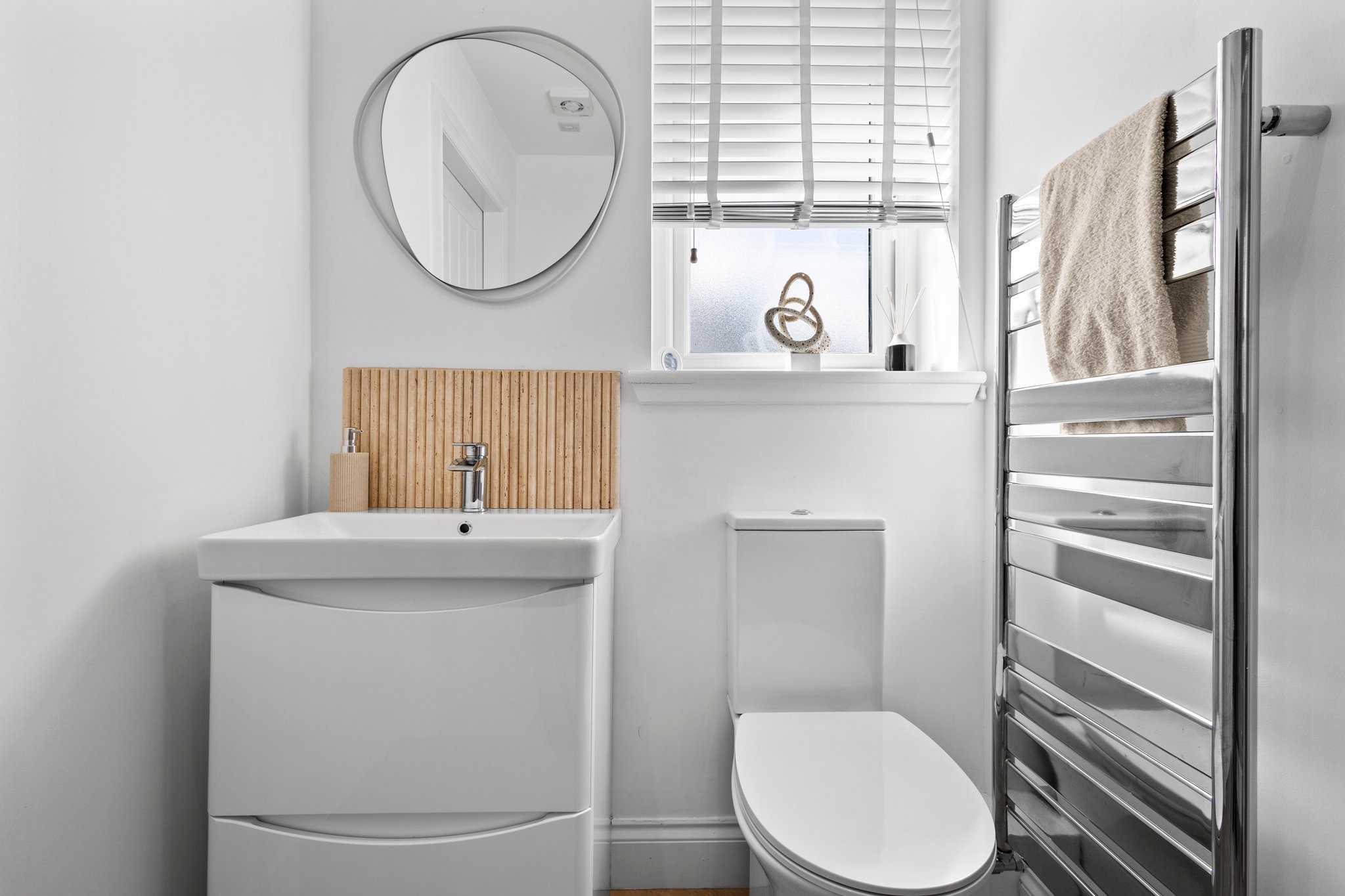 6′ 6″ x 7′ 2″ (1.98m x 2.18m) Completing the internal accommodation is the three piece family bathroom comprising of vanity sink with splashback tiling, wc and bath with wet wall finish and overhead Thermostatic mixer shower, chrome towel rail.