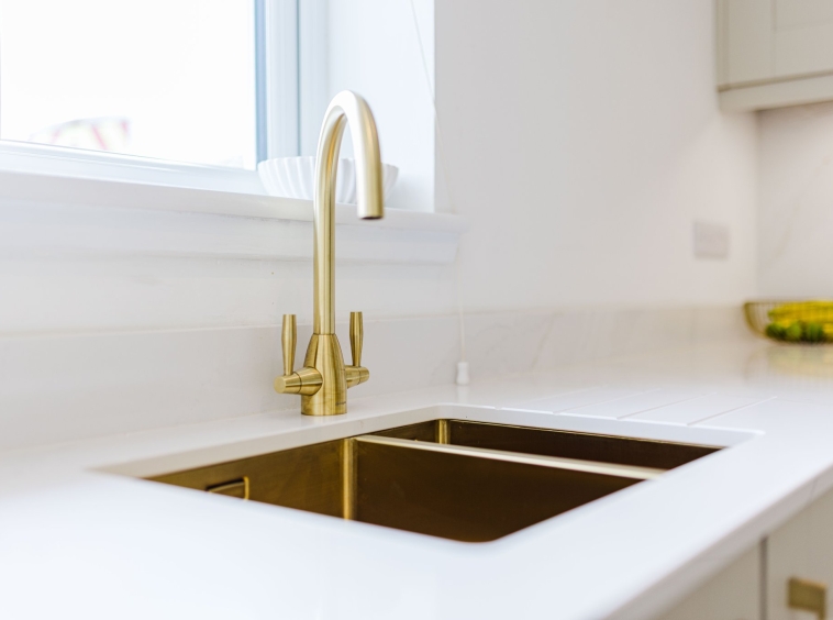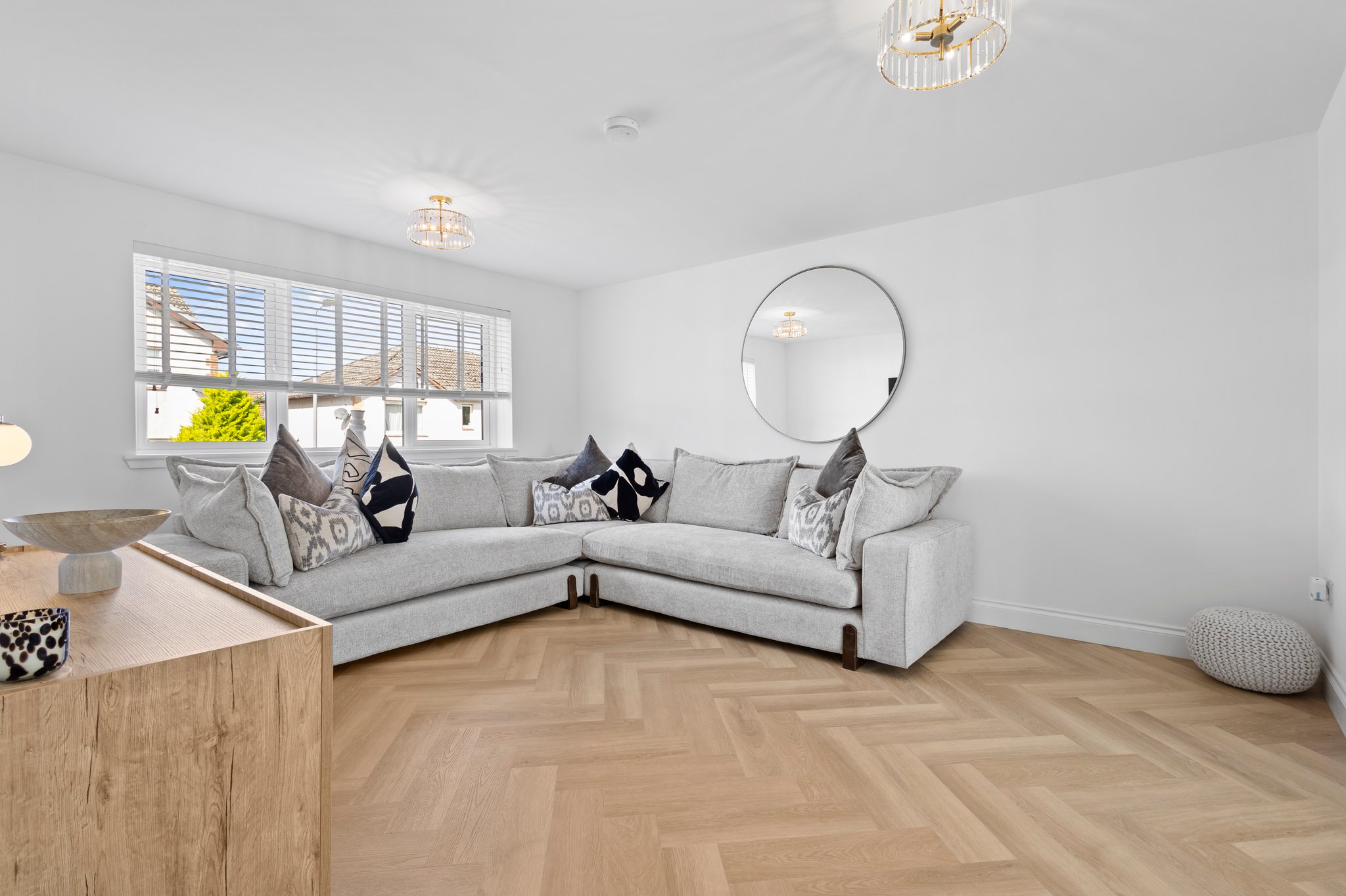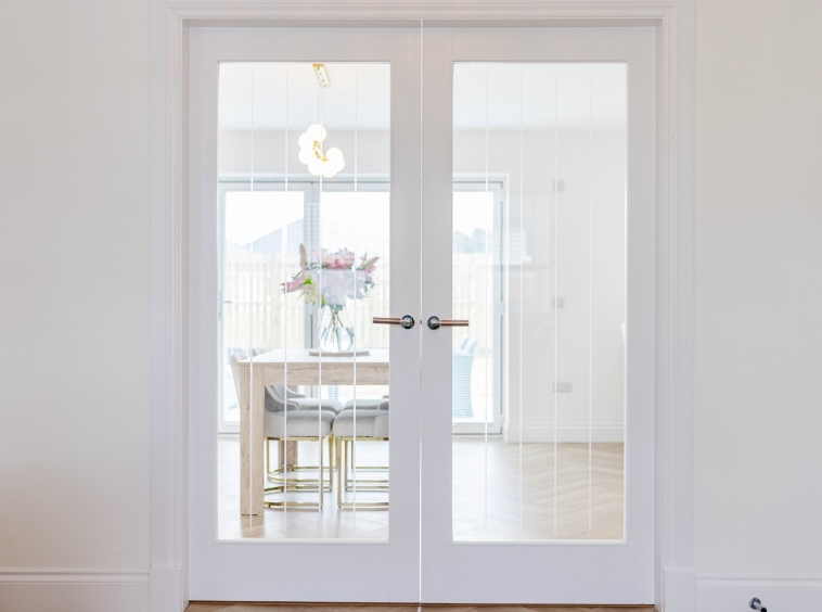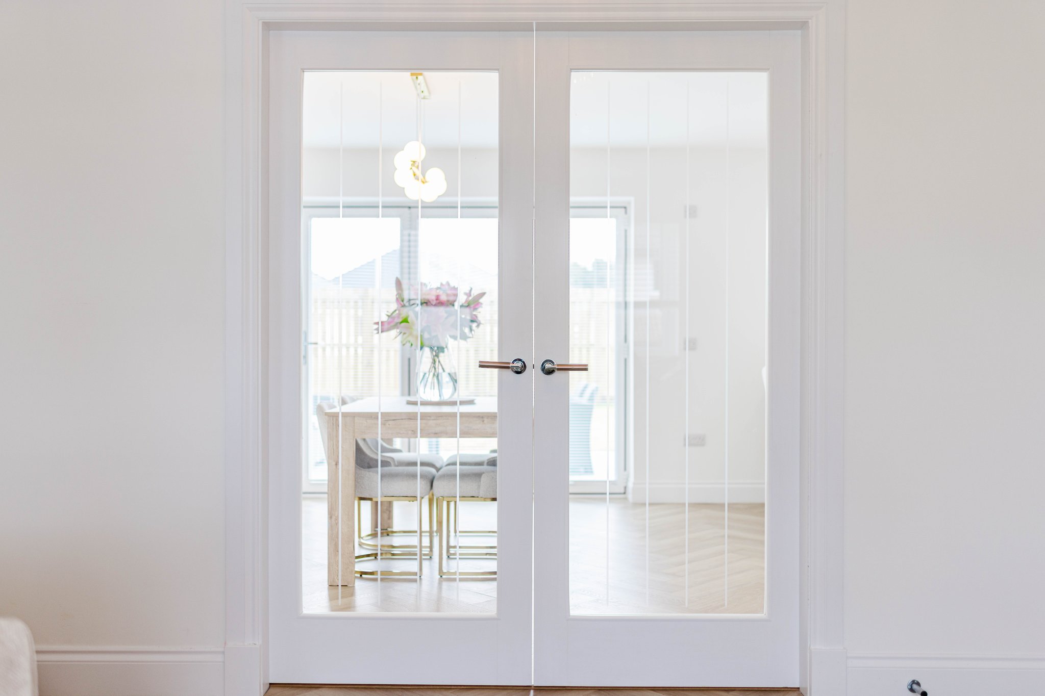 16′ 7″ x 27′ 7″ (5.05m x 8.41m) With double door access from hallway and boasting contemporary open plan layout to kitchen, the formal lounge/dining room is an stunning, expansive main apartment offering crisp white decor, white gloss finishings to wood work, white deep mould skirting and matching architraves, plentiful space for freestanding furniture, complete with two TV points, USB charger socket and modern Bi-fold doors leading out to the landscaped rear gardens.