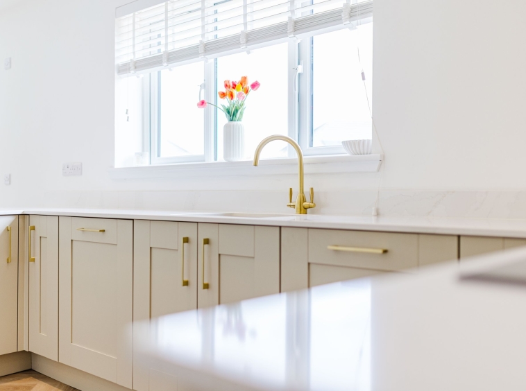 10′ 7″ x 12′ 8″ (3.23m x 3.86m) Modern fully fitted designer kitchen complete with integrated appliances including four zone induction hob, oven and extractor, fridge/freezer and dishwasher, one and a half bowl sink with tap and practical USB charger socket. A contemporary open plan layout to dining/lounge and door access to utility room.