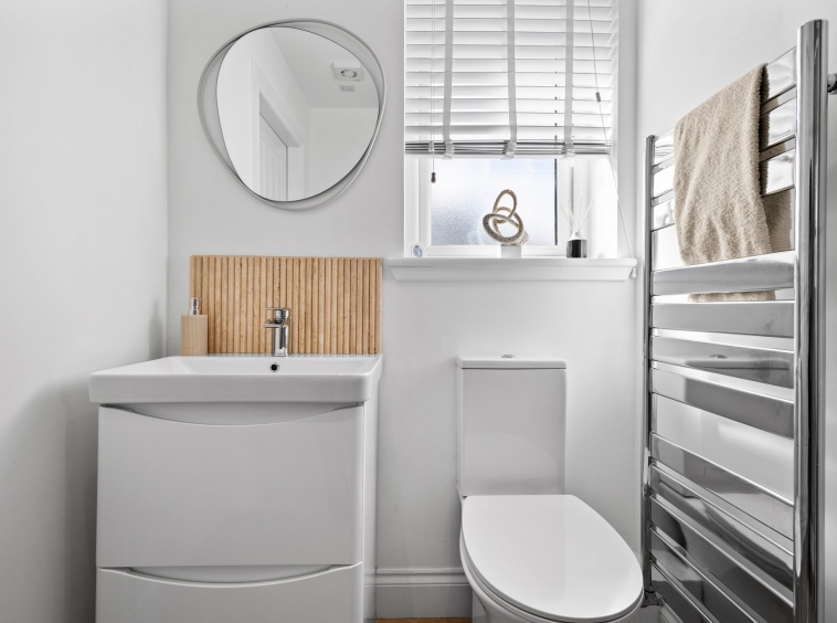 6′ 6″ x 7′ 8″ (1.98m x 2.34m) Completing the internal accommodation is the three piece family bathroom comprising of vanity sink with splashback tiling, wc and bath with wet wall finish and overhead Thermostatic mixer shower, shaver point, low energy LED downlights and double glazed opaque window to the side.