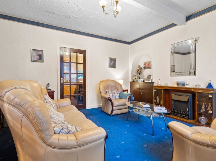 4.32m x 4.10m (14′ 2″ x 13′ 5″) Generously proportioned main apartment offering neutral decor, fireplace, fitted carpet, a double glazed window to the front and door access to the kitchen.