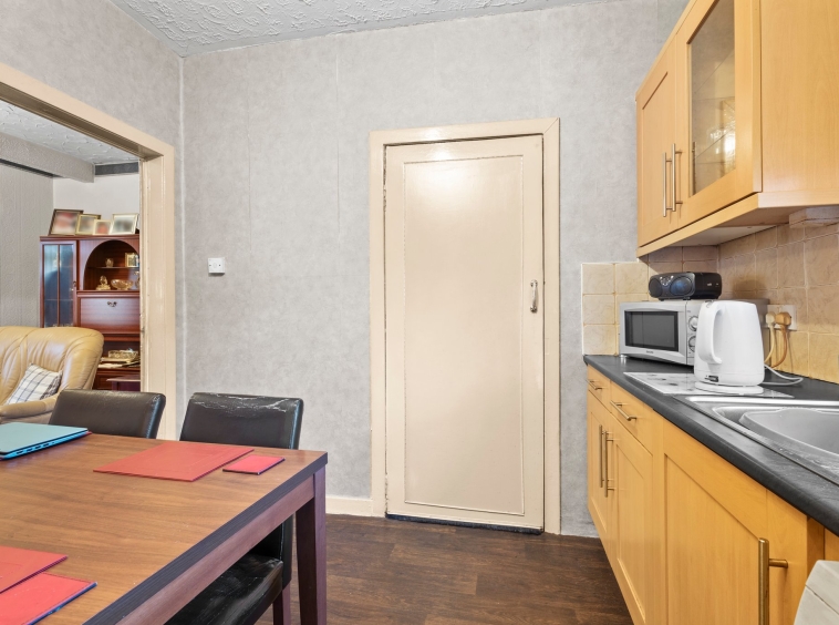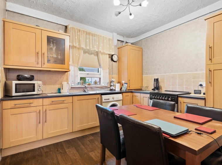 3.11m x 2.88m (10′ 2″ x 9′ 5″) Fully fitted kitchen complete with ample wall and base storage units, complimentary work surface, plumbing and space for a cooker and washing machine, stainless steel sink and drainer, neutral, vinyl, a double glazed window to the rear and access to the rear porch.
