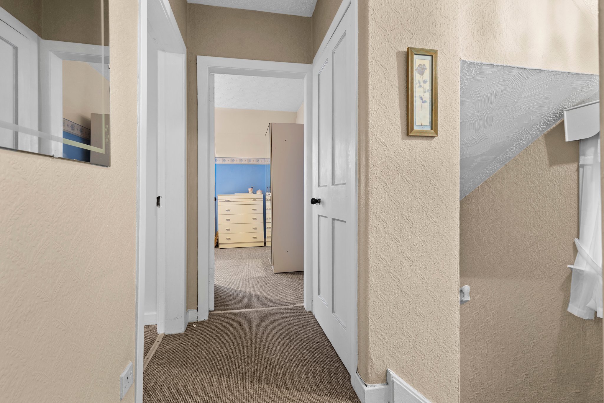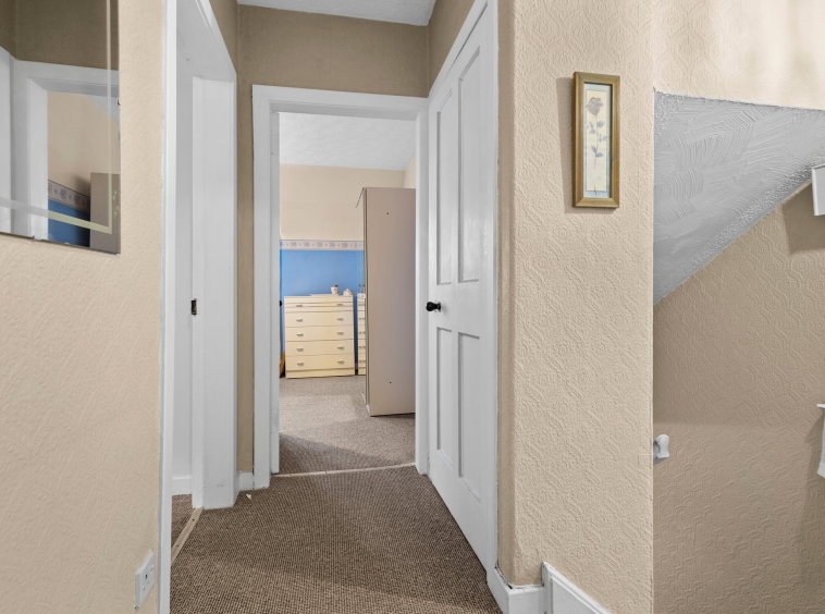 1.60m x 4.09m (5′ 3″ x 13′ 5″) Access is given via an outer door to a welcoming entrance hallway boasting neutral decor and a fitted carpet. The hallway provides access to the lounge and a carpeted staircase leads to the upper level.