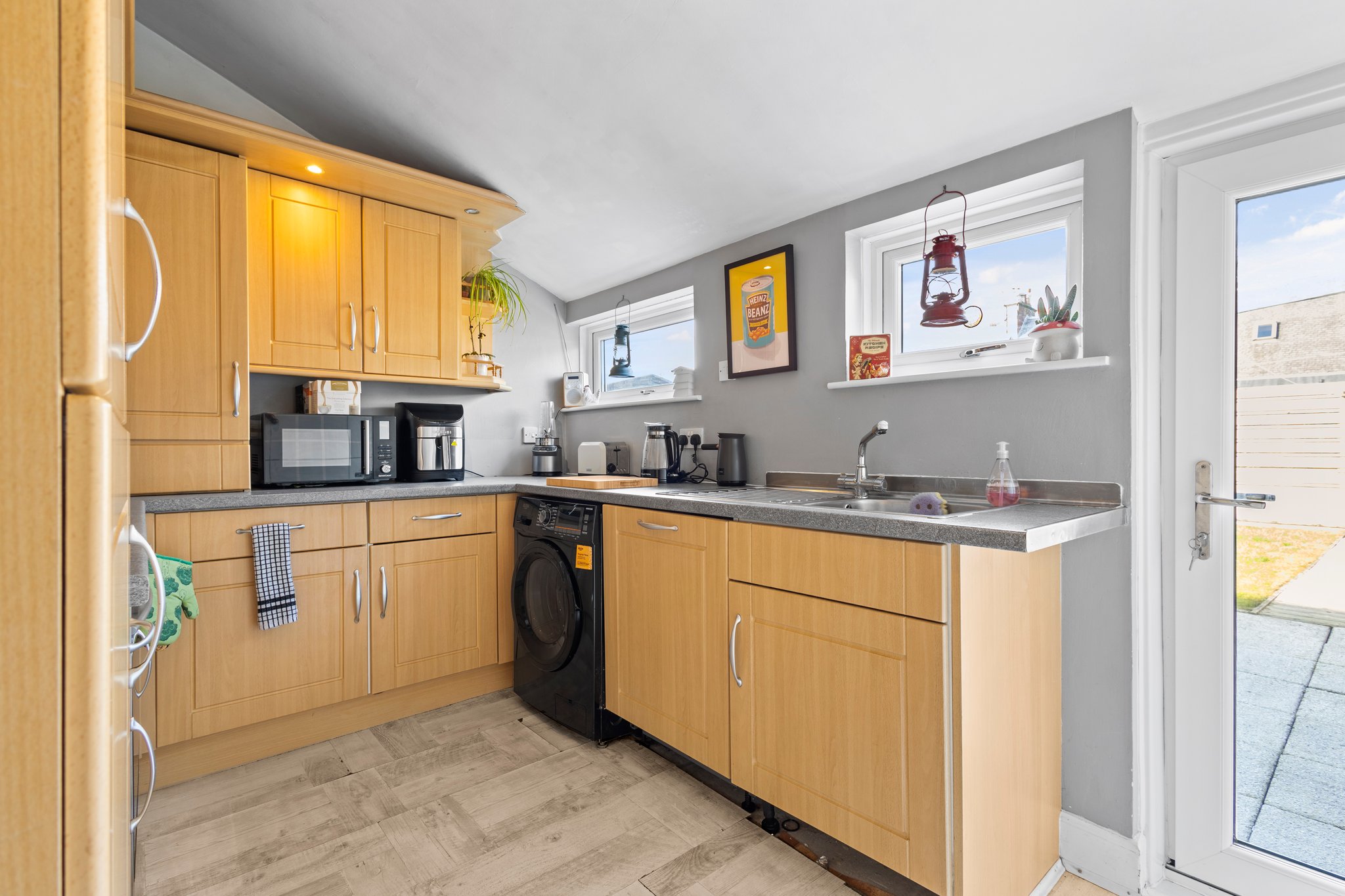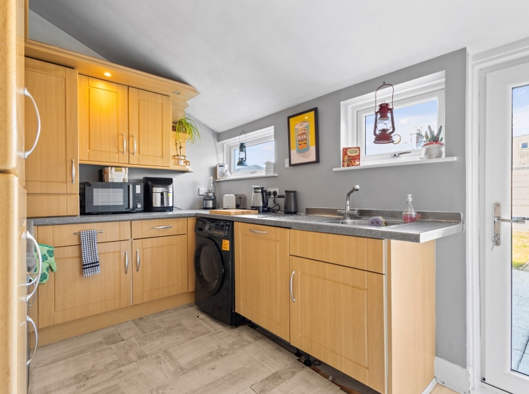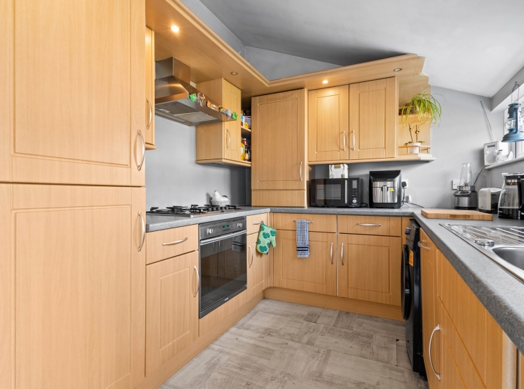 3.59m x 2.72m (11′ 9″ x 8′ 11″) Fully fitted kitchen complete with ample wall and base storage units, complimentary work surface, integrated oven, gas hob and fridge freezer, plumbing and space for a washing machine, stainless steel sink and drainer, neutral decor, vinyl flooring and two double glazed windows to the rear.