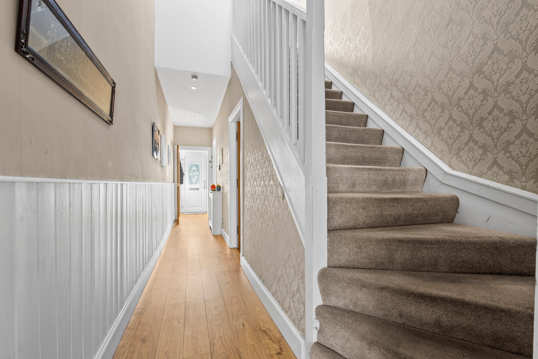 2.13m x 7.04m (7′ 0″ x 23′ 1″) Access is given to a welcoming entrance hallway boasting modern decor, practical storage cupboard and laminate flooring. The hallway provides access to the lounge, kitchen, bedroom two and a carpeted staircase leads to the upper level.