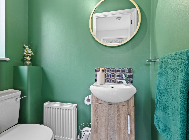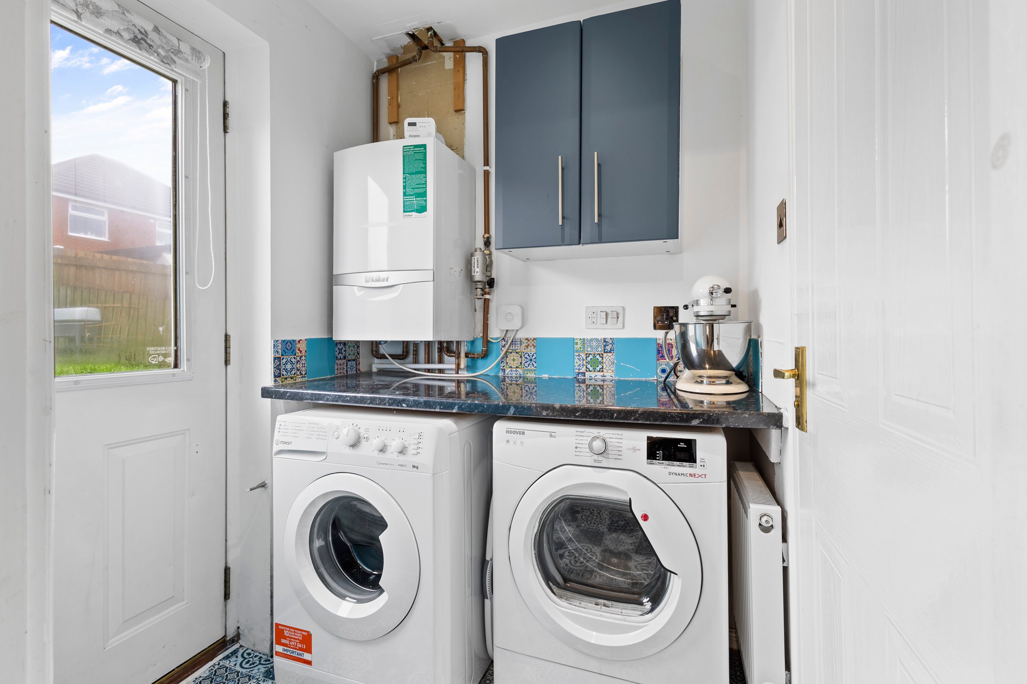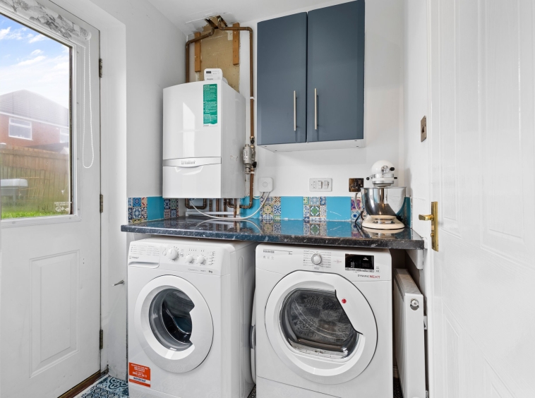 1.45m x 1.45m (4′ 9″ x 4′ 9″) Handy utility room comprising of white decor, work surface, plumbing space for washing machine and tumble drier, door access to the WC and external door leading to the rear garden.