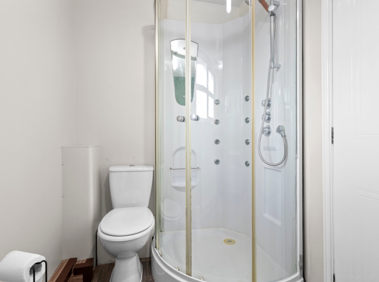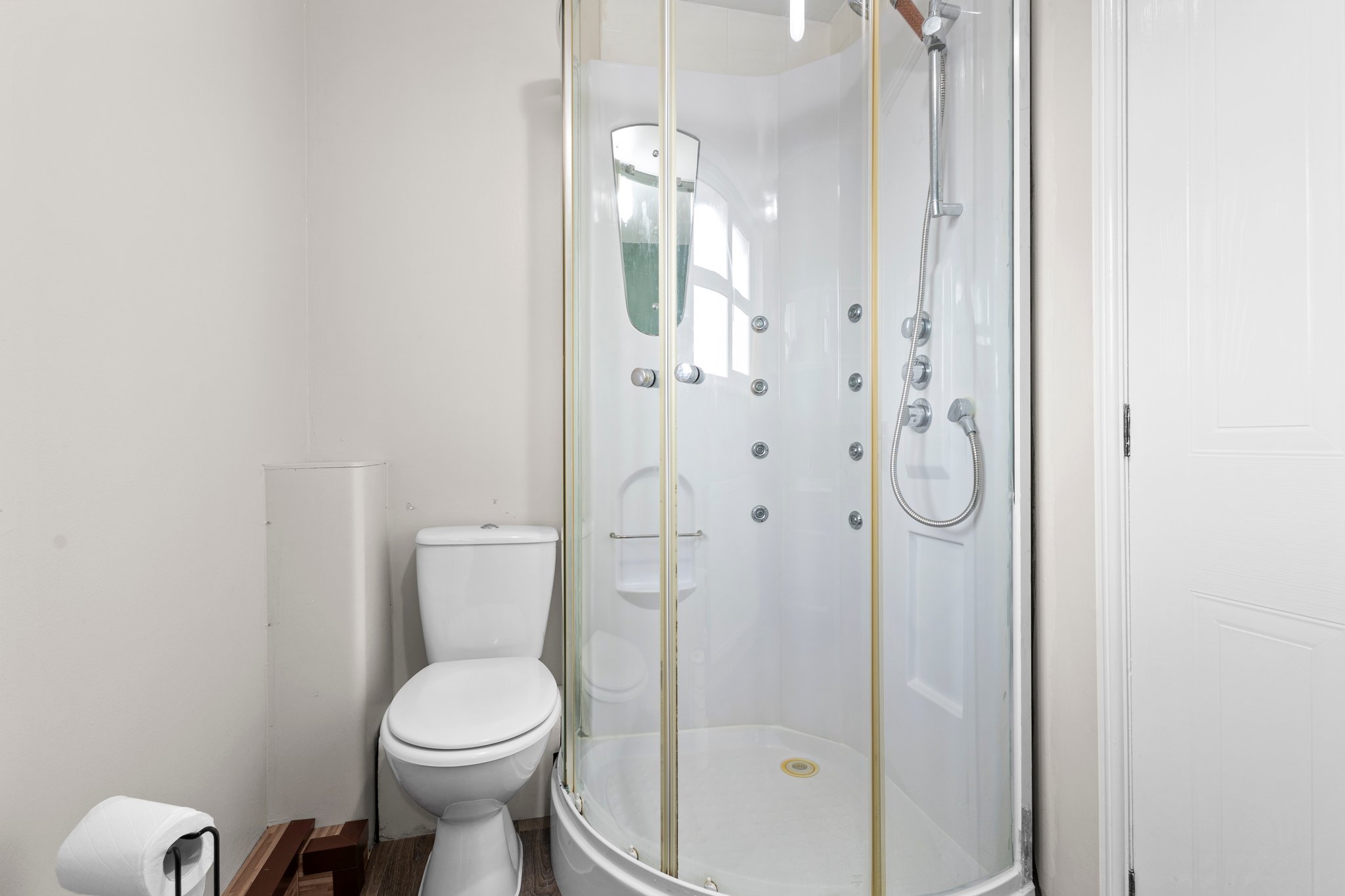 2.62m x 1.58m (8′ 7″ x 5′ 2″) Three piece ensuite comprising WC, wash hand basin with vanity storage, mains shower cubicle, contemporary decor, vinyl flooring and opaque double glazed window to the front.