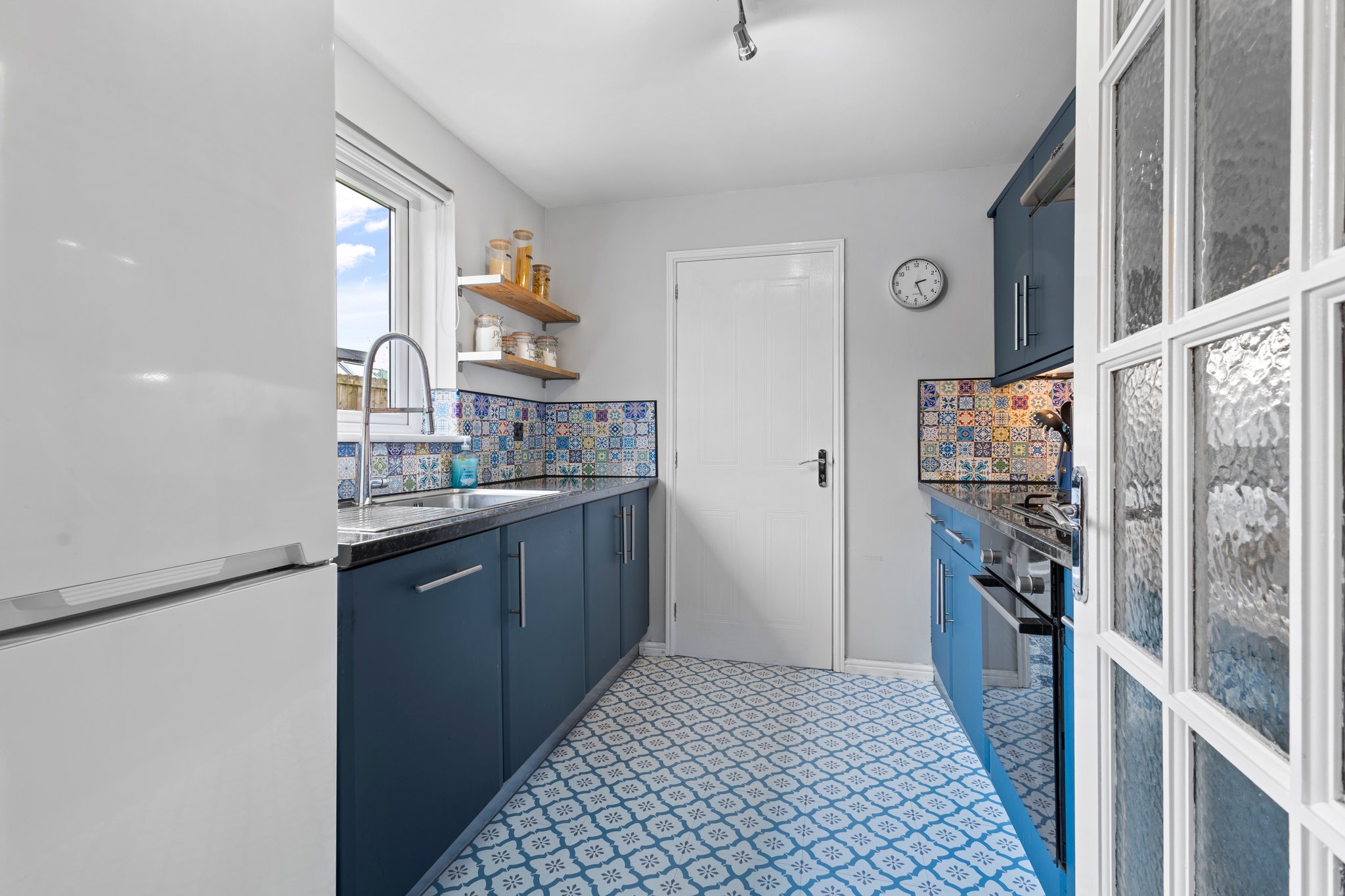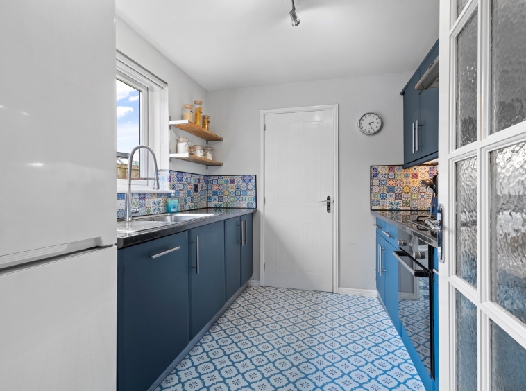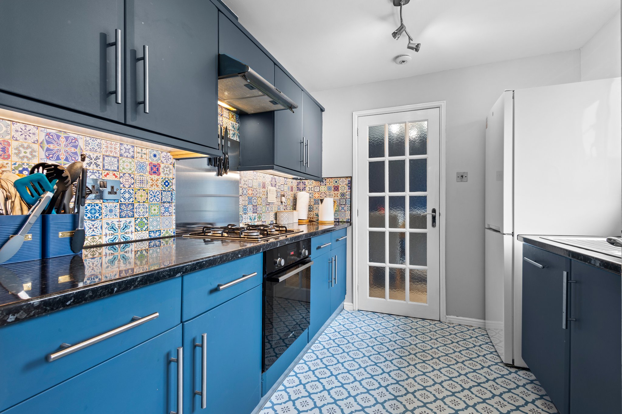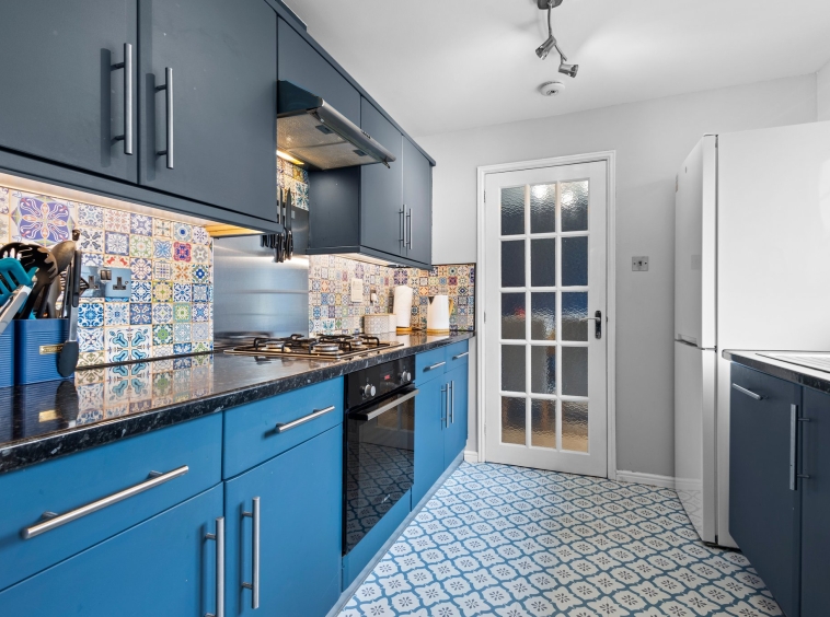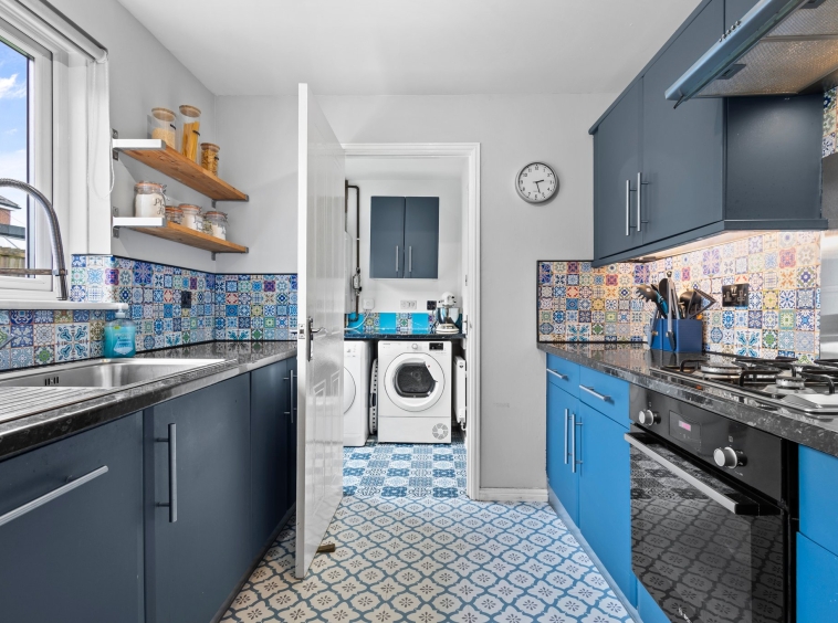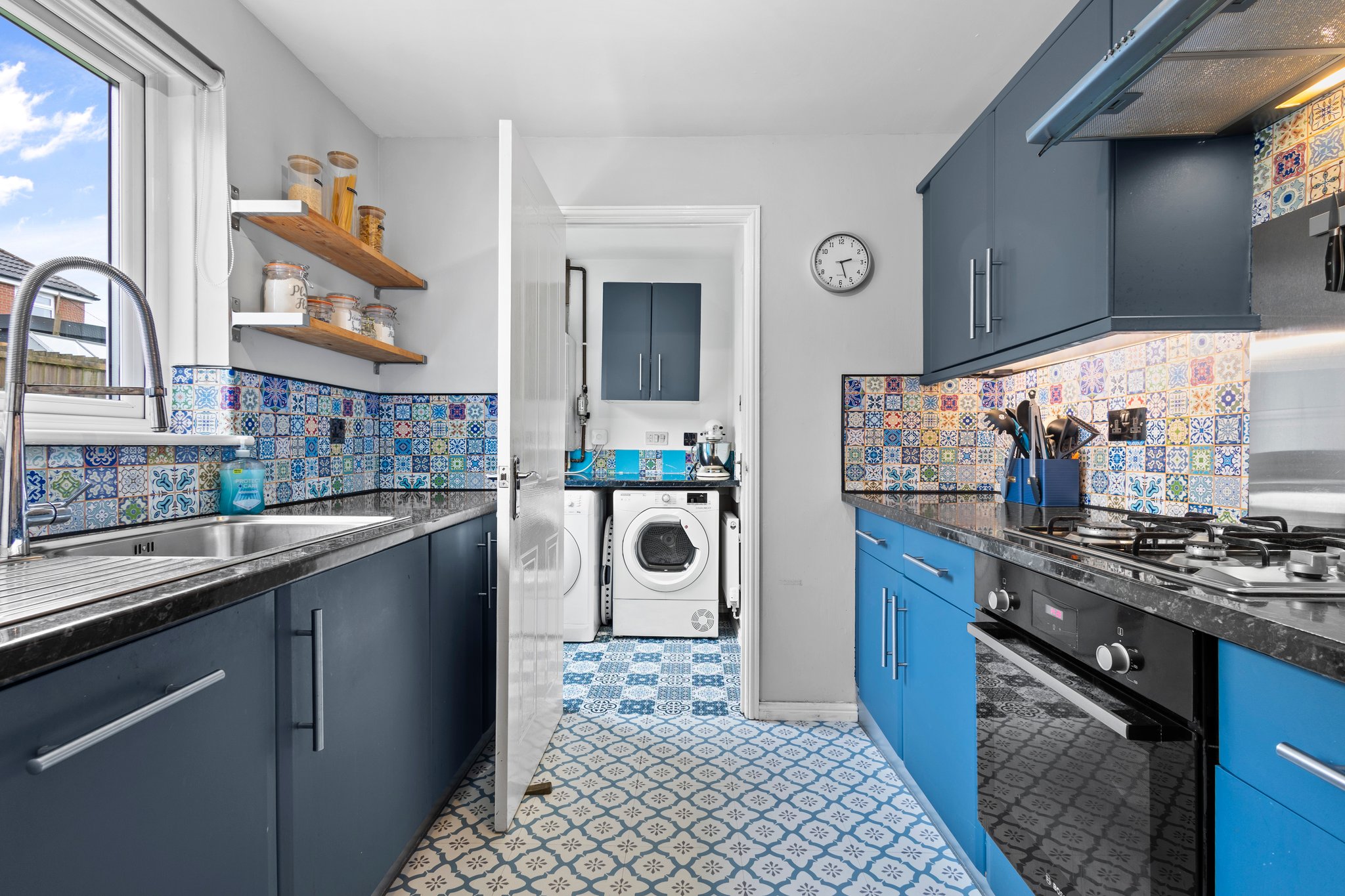 2.81m x 2.41m (9′ 3″ x 7′ 11″) Modern fully fitted kitchen offering an array of wall and base units, contrasting work surfaces, stylish tile splash back, integrated gas hob, electric oven, dish washer, stainless steel sink and drainer, space for fridge freezer, stylish laminate tiles, double glazed window to the rear and door access to the utility room/WC.