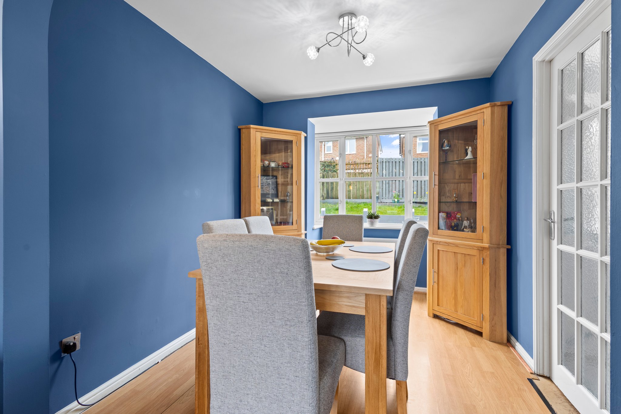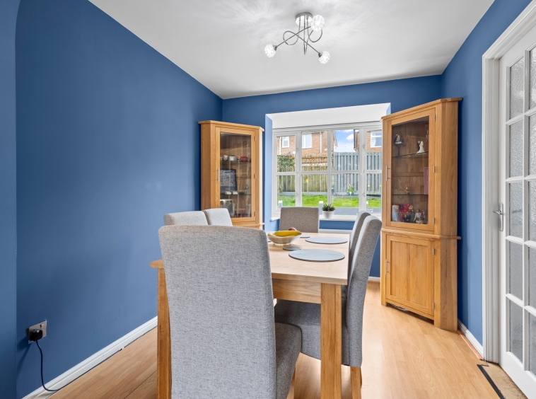 2.42m x 3.15m (7′ 11″ x 10′ 4″) Dining area with modern decor, laminate flooring, door access to the kitchen and double glazed bay window to the rear.