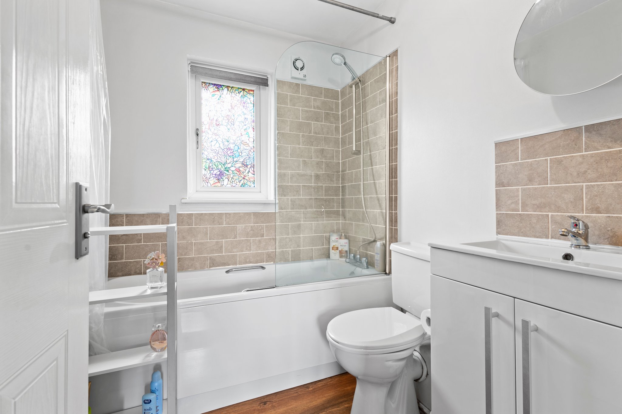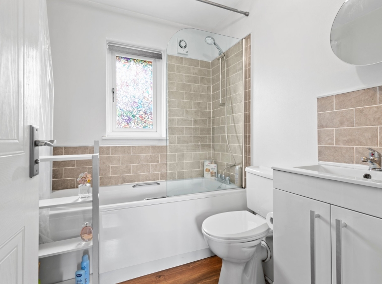 1.73m x 2.21m (5′ 8″ x 7′ 3″) Completing the property is the three piece bathroom comprising of WC, wash hand basin with vanity storage, mixer shower over bath, crisp white decor, with tiles around the bath, laminate flooring, opaque double glazed window to the rear.