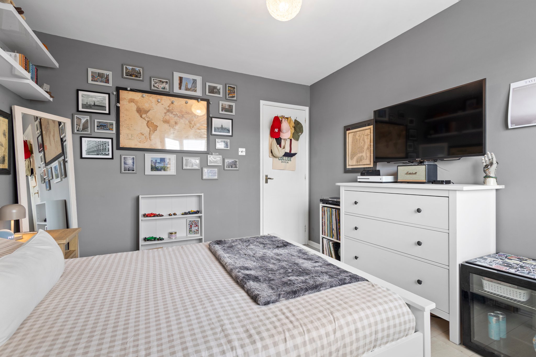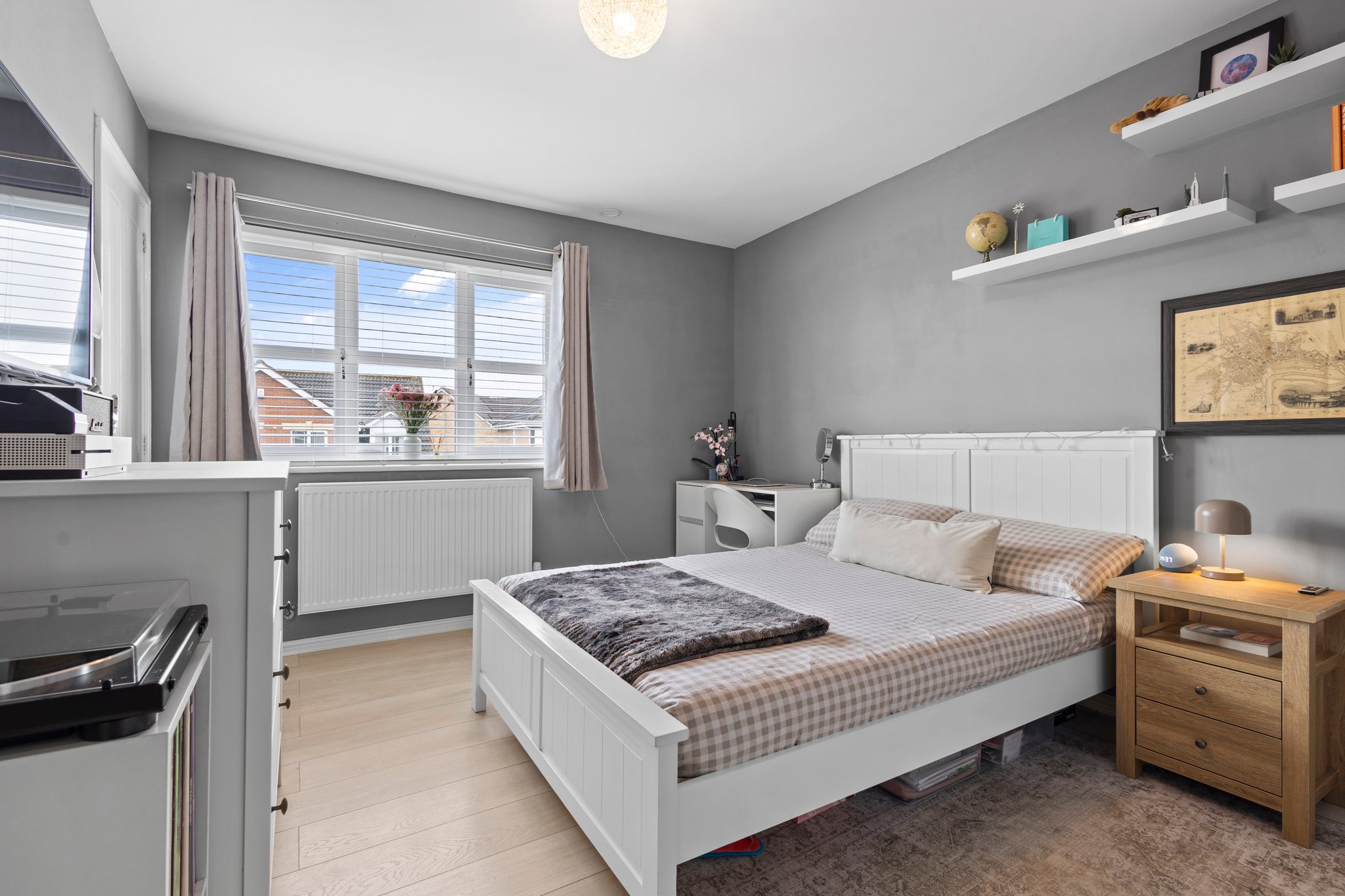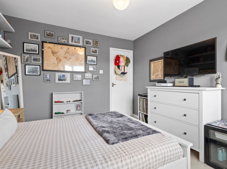 3.13m x 3.33m (10′ 3″ x 10′ 11″) Generous double bedroom featuring modern decor, laminate flooring, storage cupboard and double glazed window to the front.