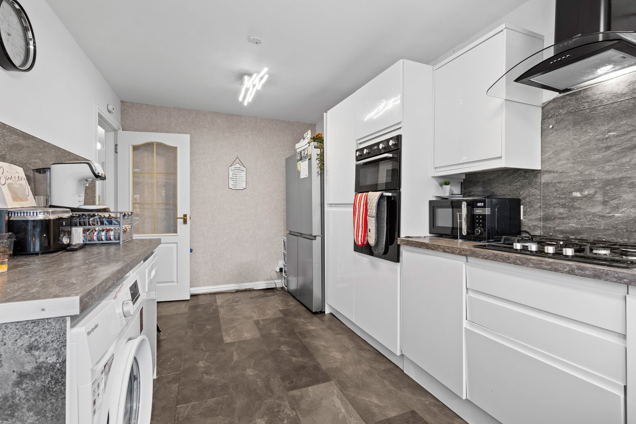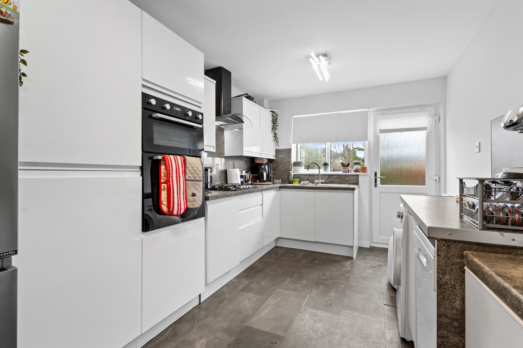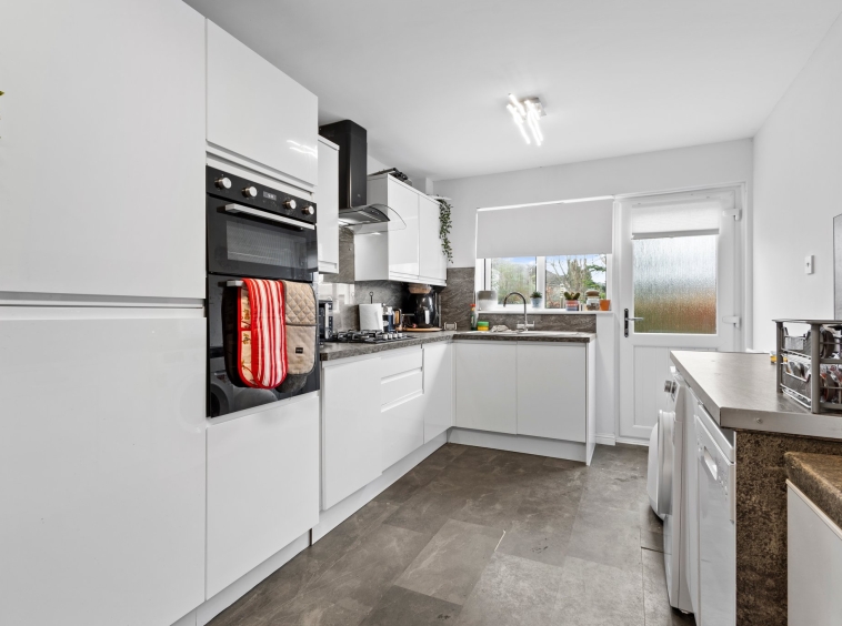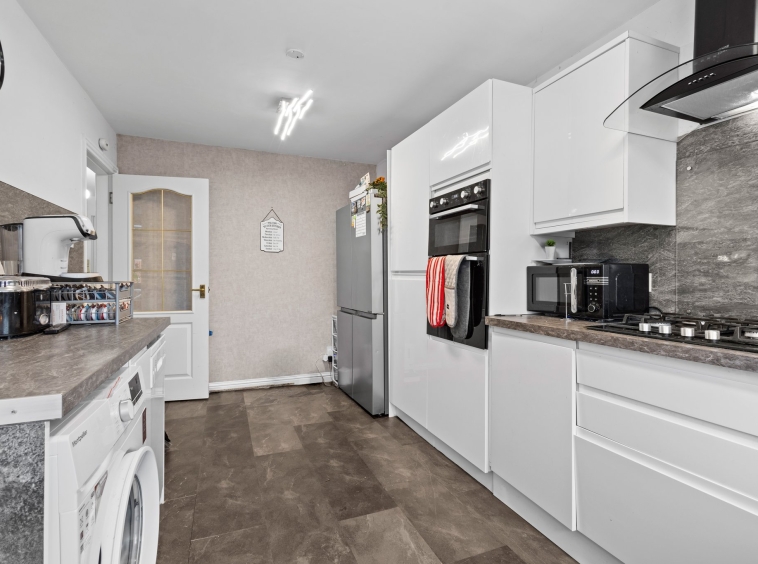 4.76m x 2.70m (15′ 7″ x 8′ 10″) Stylish fully fitted kitchen offering white gloss wall and base storage units with complementary work surfaces, stainless steel sink and drainer, integrated oven and gas hob. Plumbing/space for appliances including washing machine, dishwasher and fridge/freezer, neutral decor, vinyl flooring, double glazed window to the rear and a door leading to rear gardens.