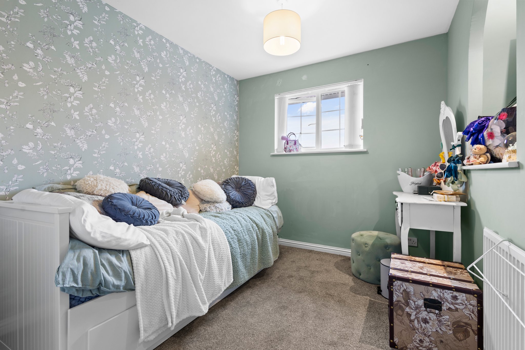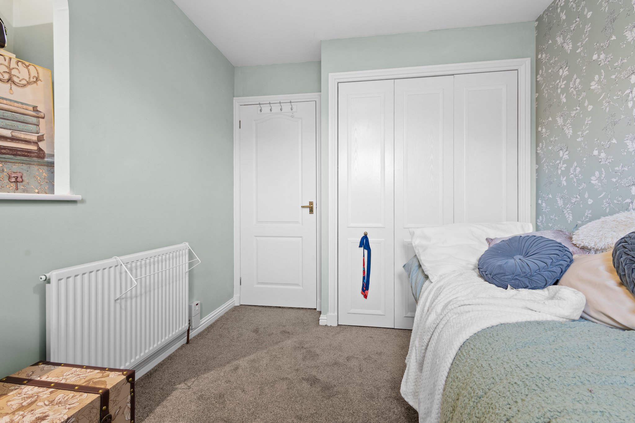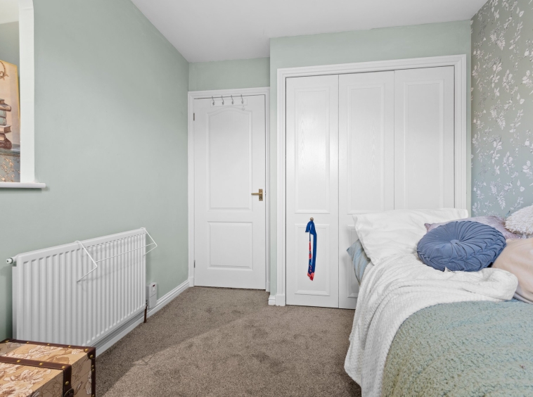 3.29m x 2.52m (10′ 10″ x 8′ 3″) Bedroom three is front facing with a double glazed window, stylish decor, fitted carpet and triple door fitted wardrobes providing storage space.