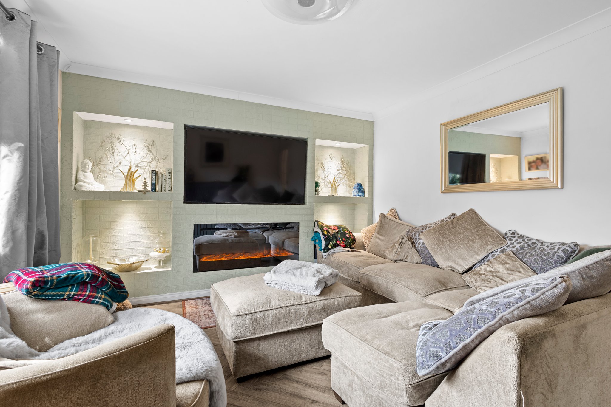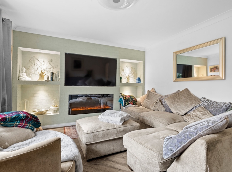 4.16m x 3.66m (13′ 8″ x 12′ 0″) The formal lounge is a generously proportioned main apartment with hardwood flooring, fresh neutral decor with ceiling coving and a feature media wall. Large double glazed window to the rear overlooking the gardens.