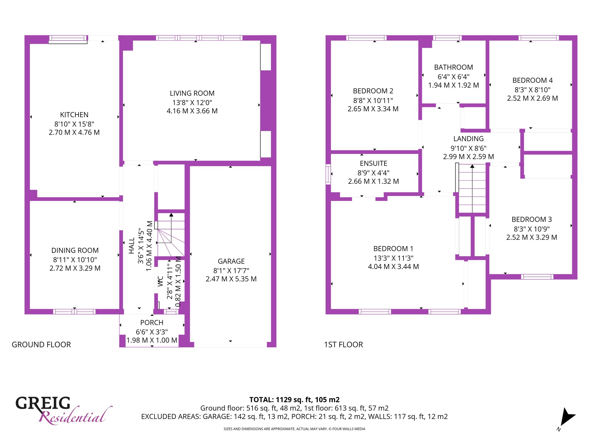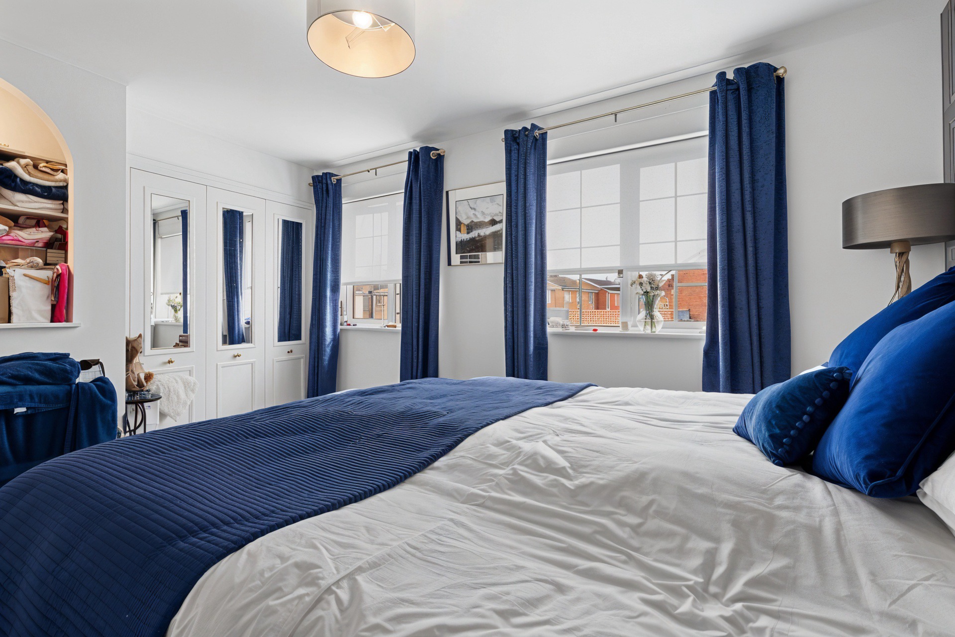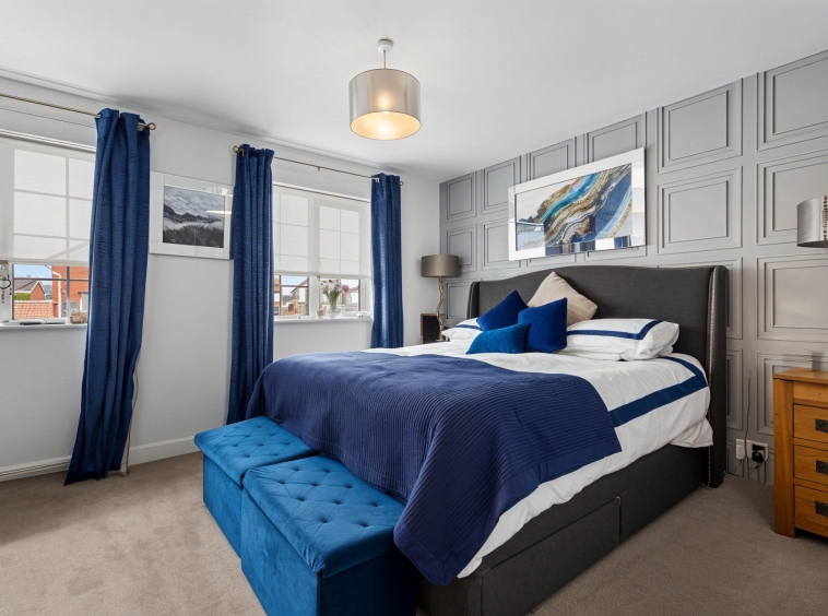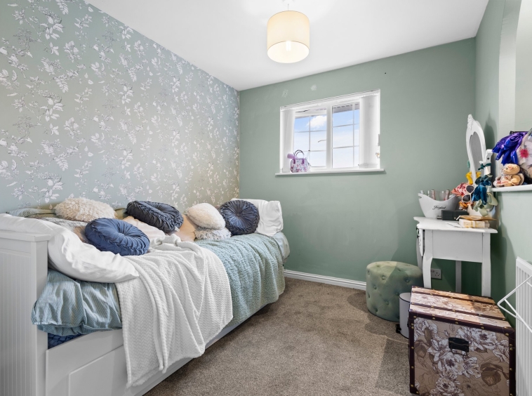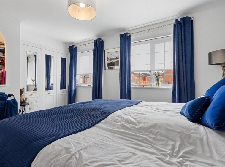 2.69m x 2.52m (8′ 10″ x 8′ 3″) The fourth bedroom is sizable and offers fresh neutral decor, triple door fitted wardrobes, fitted carpet and a double glazed window to the rear overlooking the gardens.