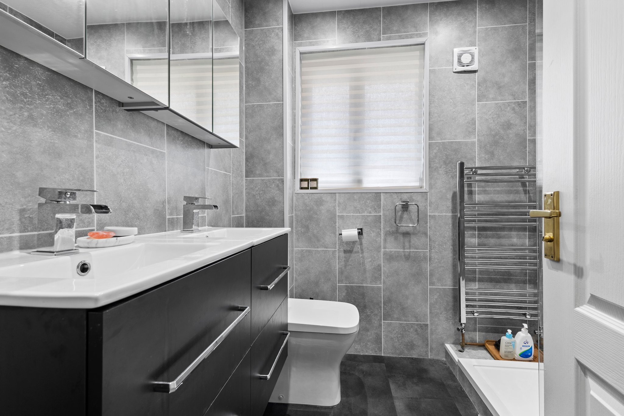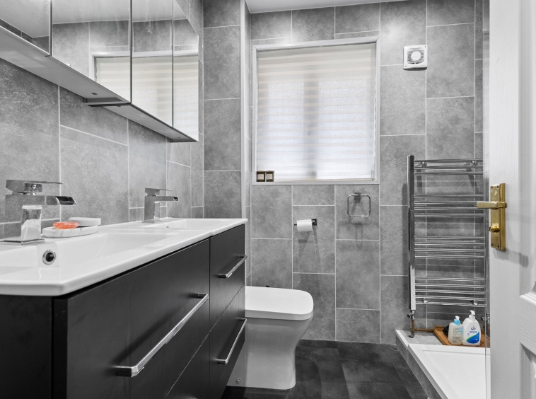 1.94m x 1.92m (6′ 4″ x 6′ 4″) Competing the accommodation is the three piece family shower room comprising of a wc, ‘His n Hers’ wash hand basins with vanity storage and walk in shower cubicle with overhead mains shower. Contemporary wet wall finish to walls, vinyl flooring, ceiling spotlights, heated towel rail and a double glazed opaque window to the rear.