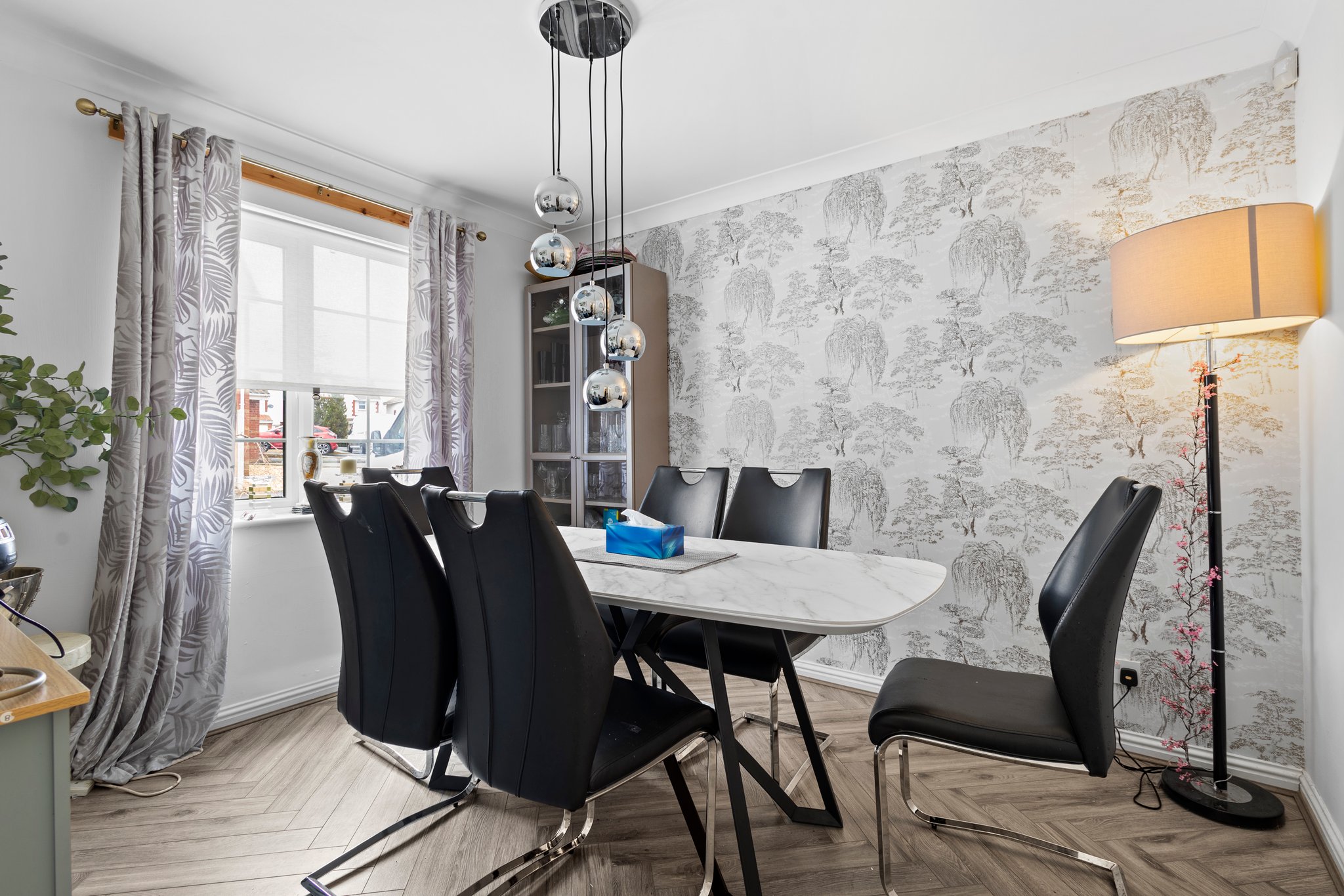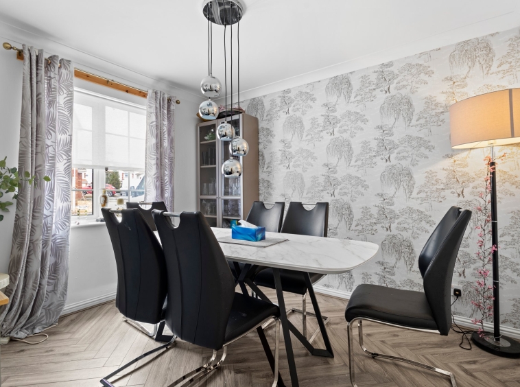 3.29m x 2.72m (10′ 10″ x 8′ 11″) Spacious dining room which is a flexible use room is complete with contemporary decor, ceiling coving, hardwood flooring and a double glazed window to the front.
