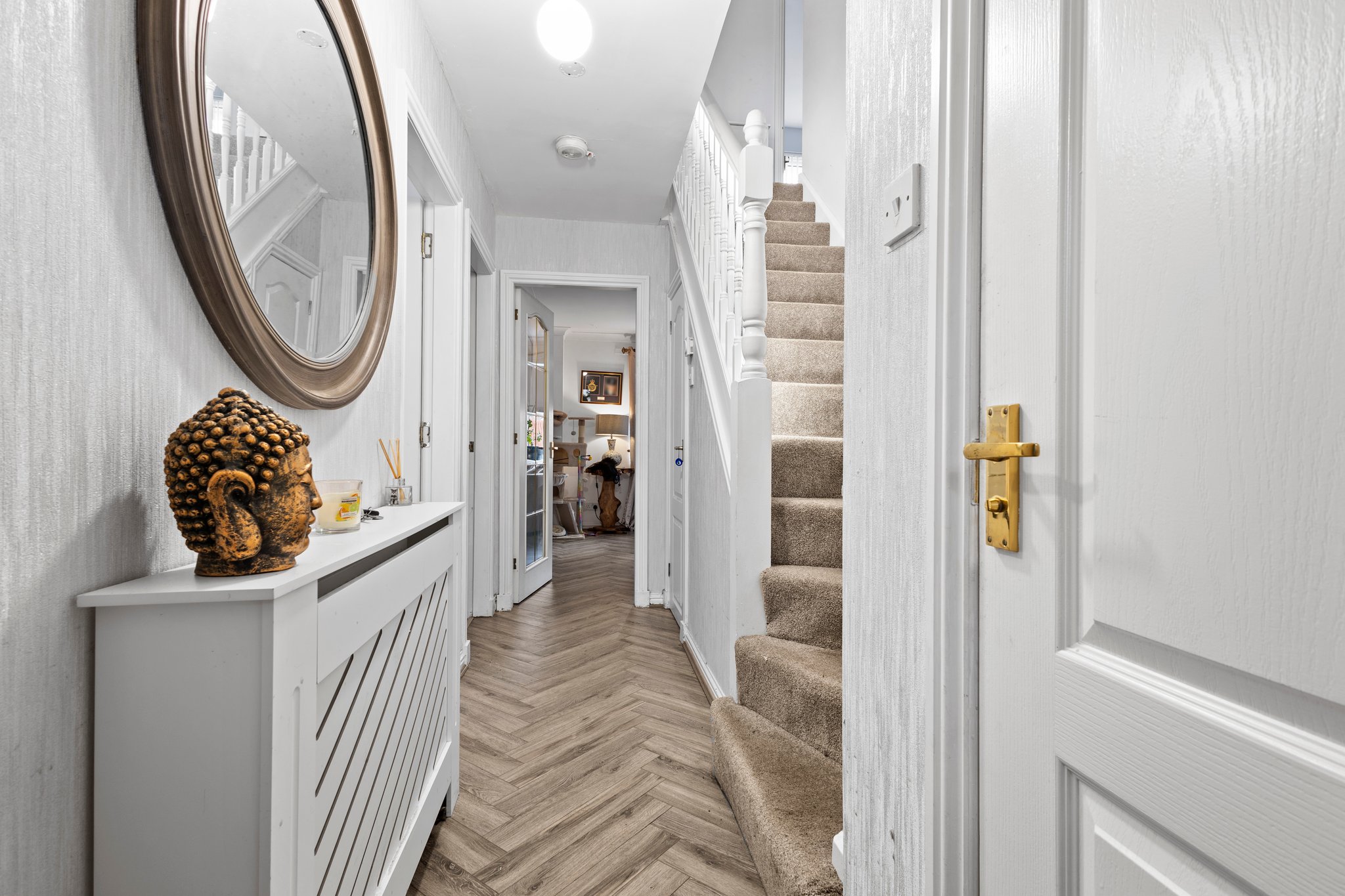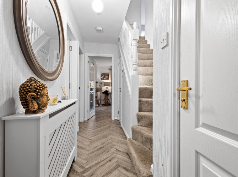 4.40m x 1.06m (14′ 5″ x 3′ 6″) The welcoming entrance hallway is complete with hardwood flooring, neutral decor and door access to wc/cloaks, lounge, dining room and kitchen. Carpeted staircase leading to upper level, and a practical storage cupboard.
