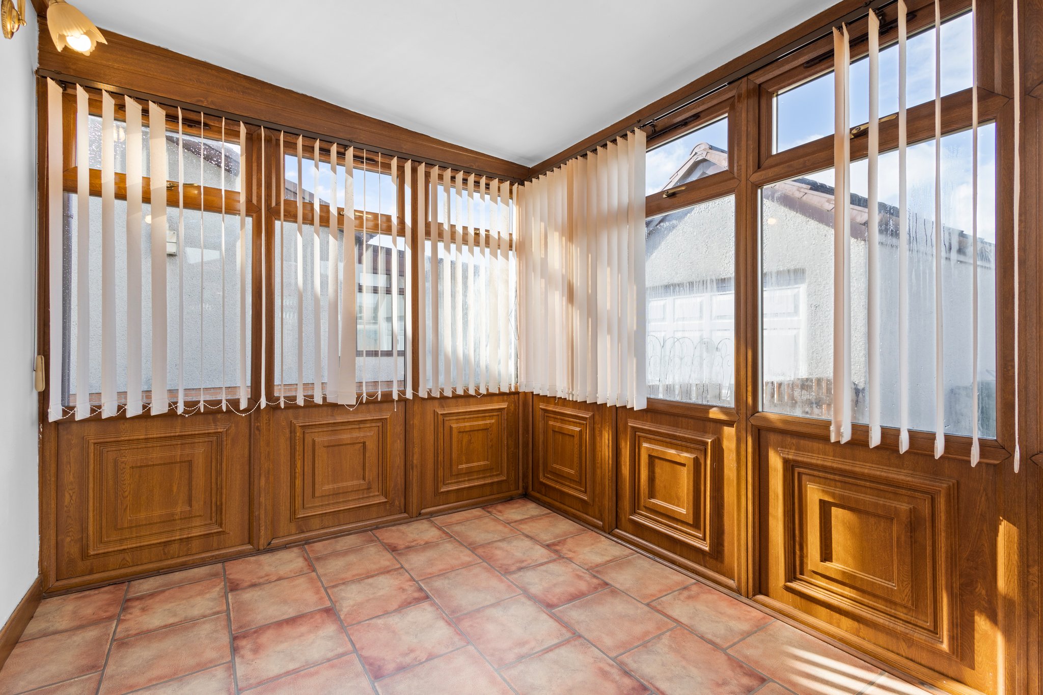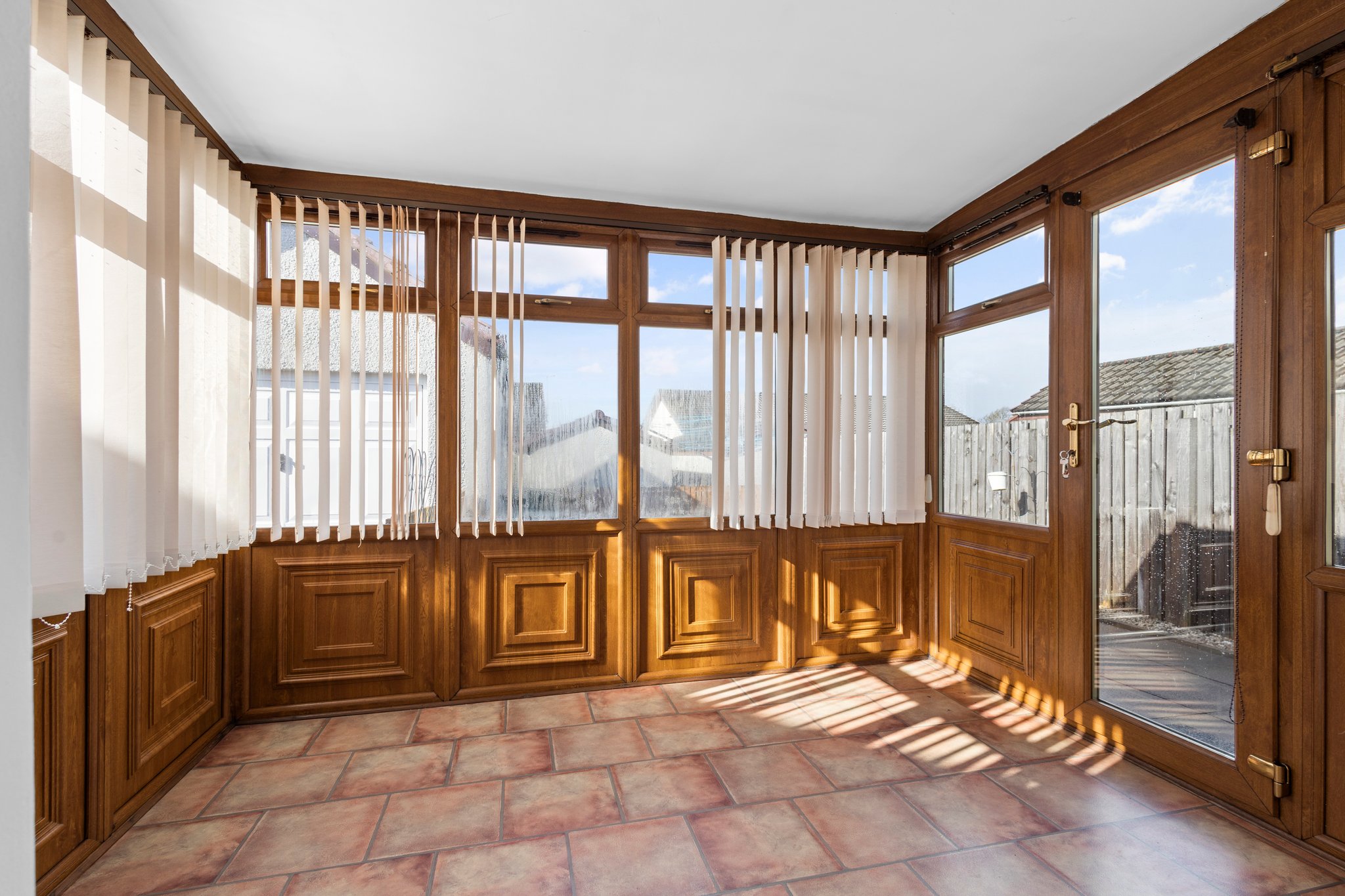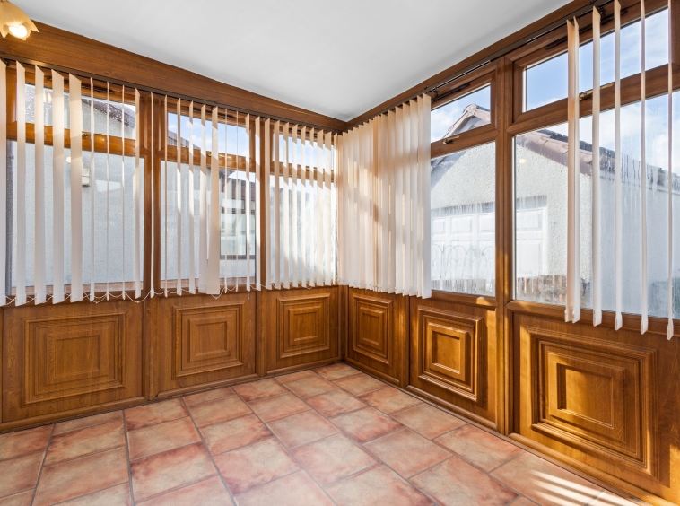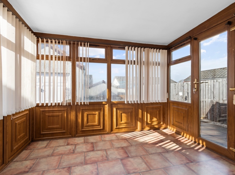 2.44m x 2.87m (8′ 0″ x 9′ 5″) Providing additional living space, the idyllic rear conservatory offers neutral decor, vinyl flooring and double glazed doors leading out into the gardens.