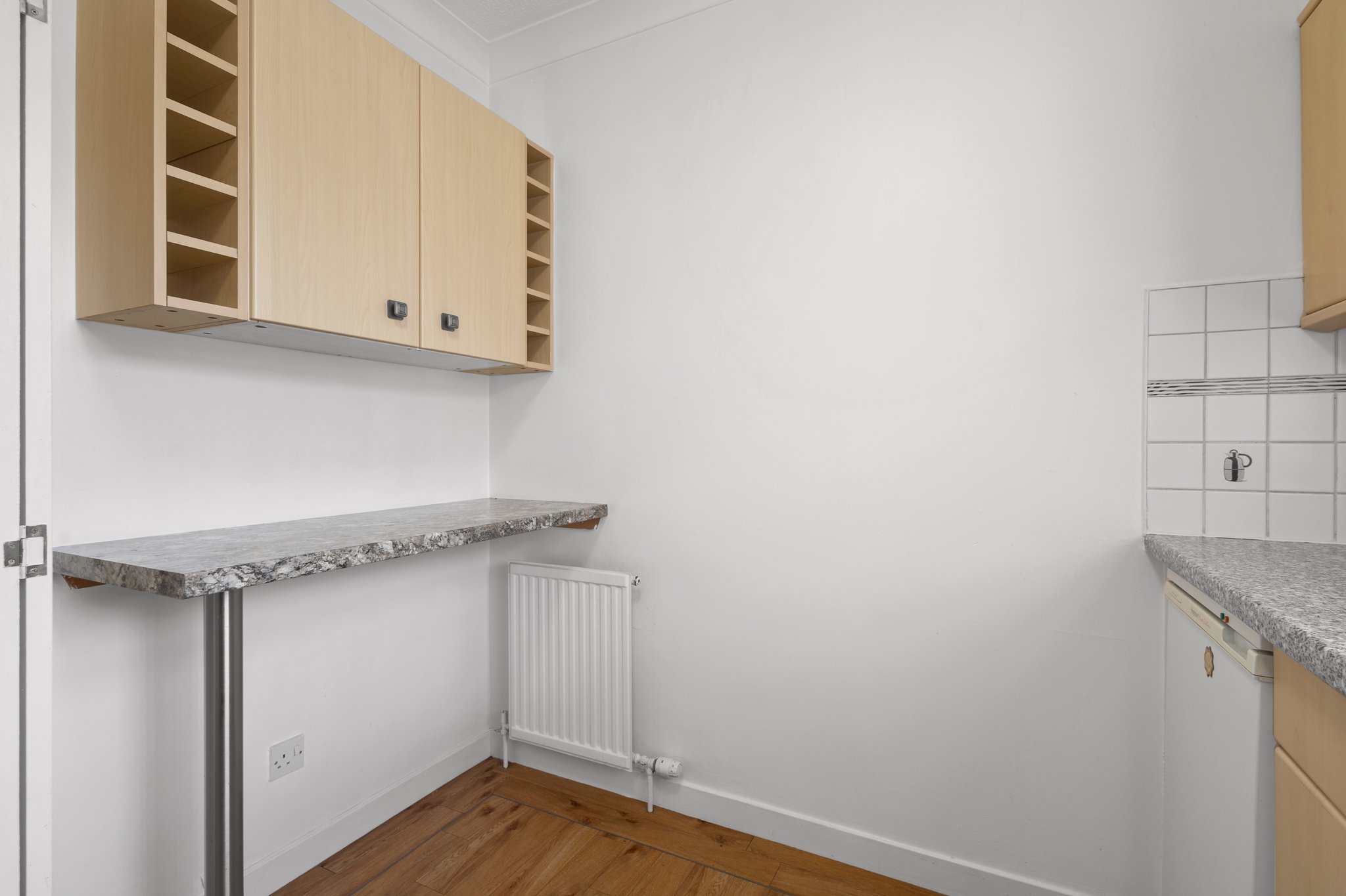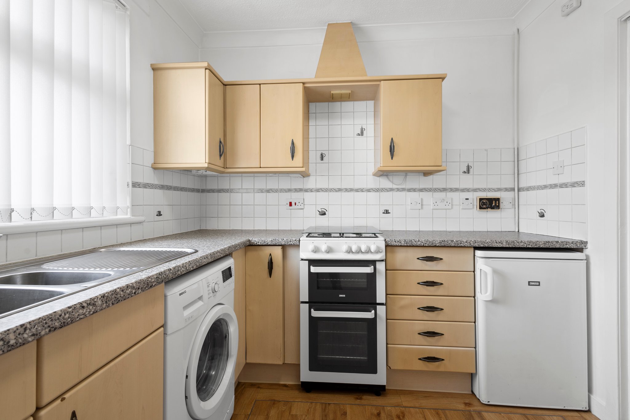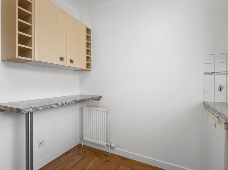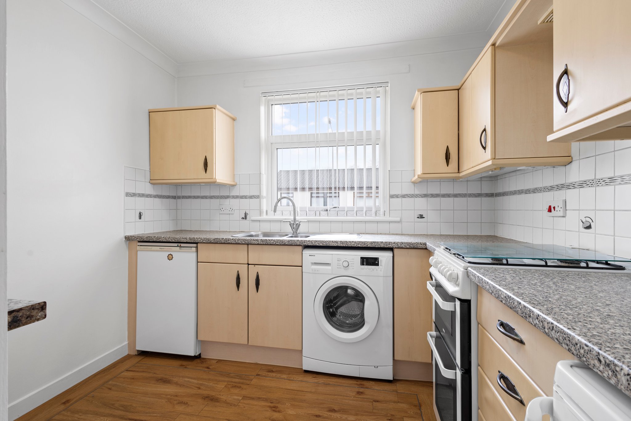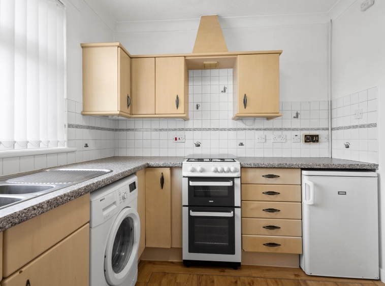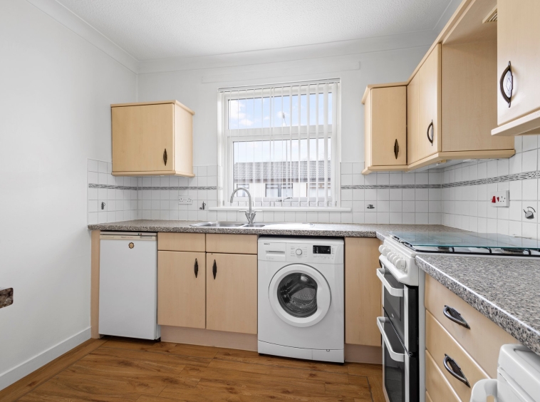 2.51m x 2.93m (8′ 3″ x 9′ 7″) Generous, fully fitted kitchen offering a range of wall and base storage units with complementary work surfaces, plumbing/space for appliances including cooker, washing machine and fridge/freezer. Stainless steel sink and drainer, neutral decor, LVT flooring and double glazed window to the front.