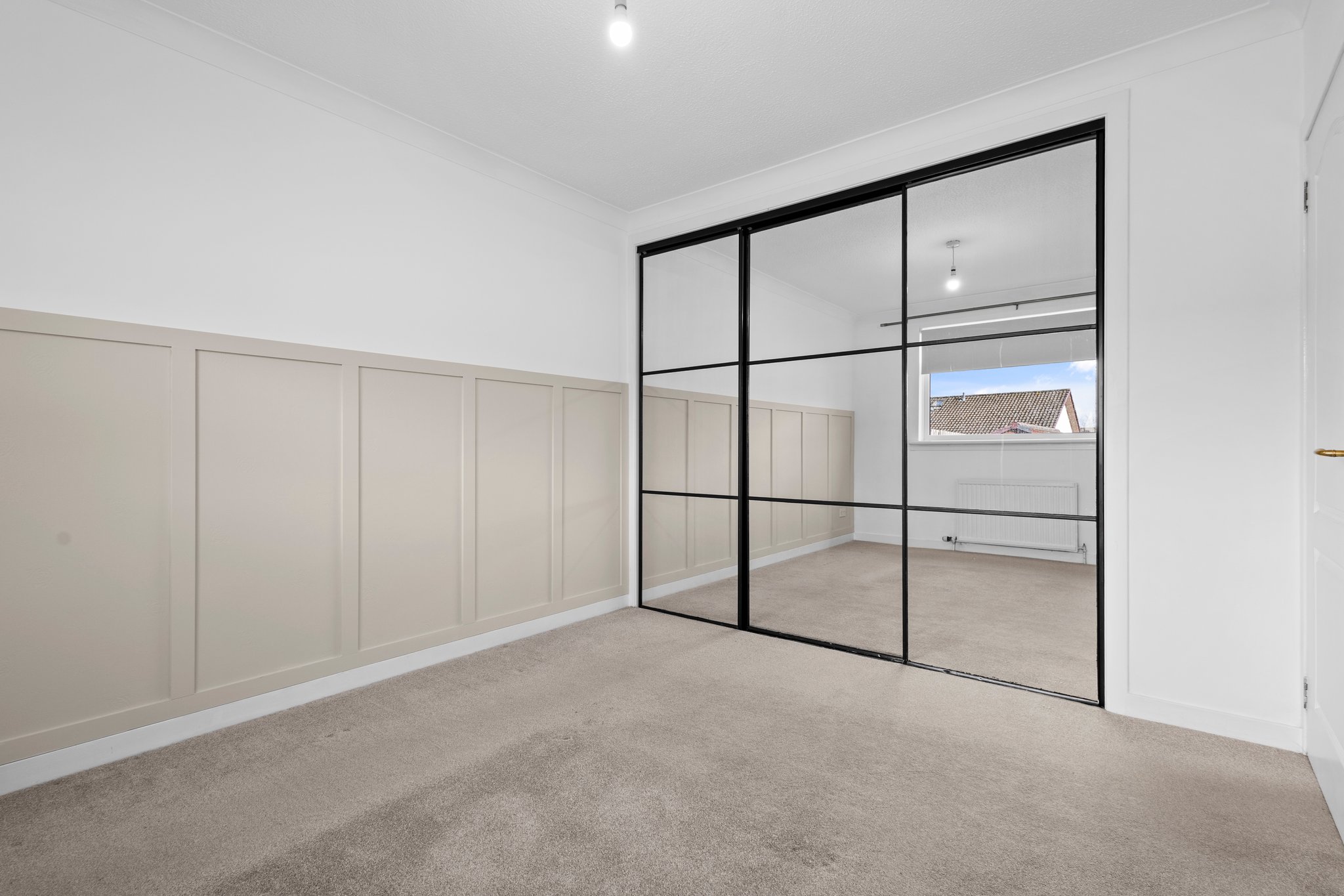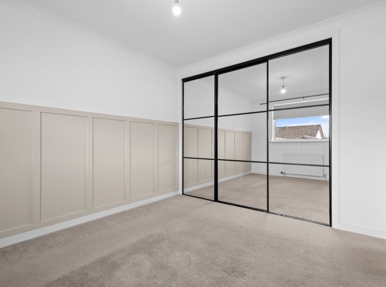 3.46m x 3.08m (11′ 4″ x 10′ 1″) The master bedroom is a generous double offering soft decor, ceiling coving, fitted carpet and triple door fitted wardrobes providing ample storage space. Double glazed window to the rear overlooking the gardens.