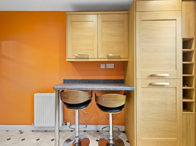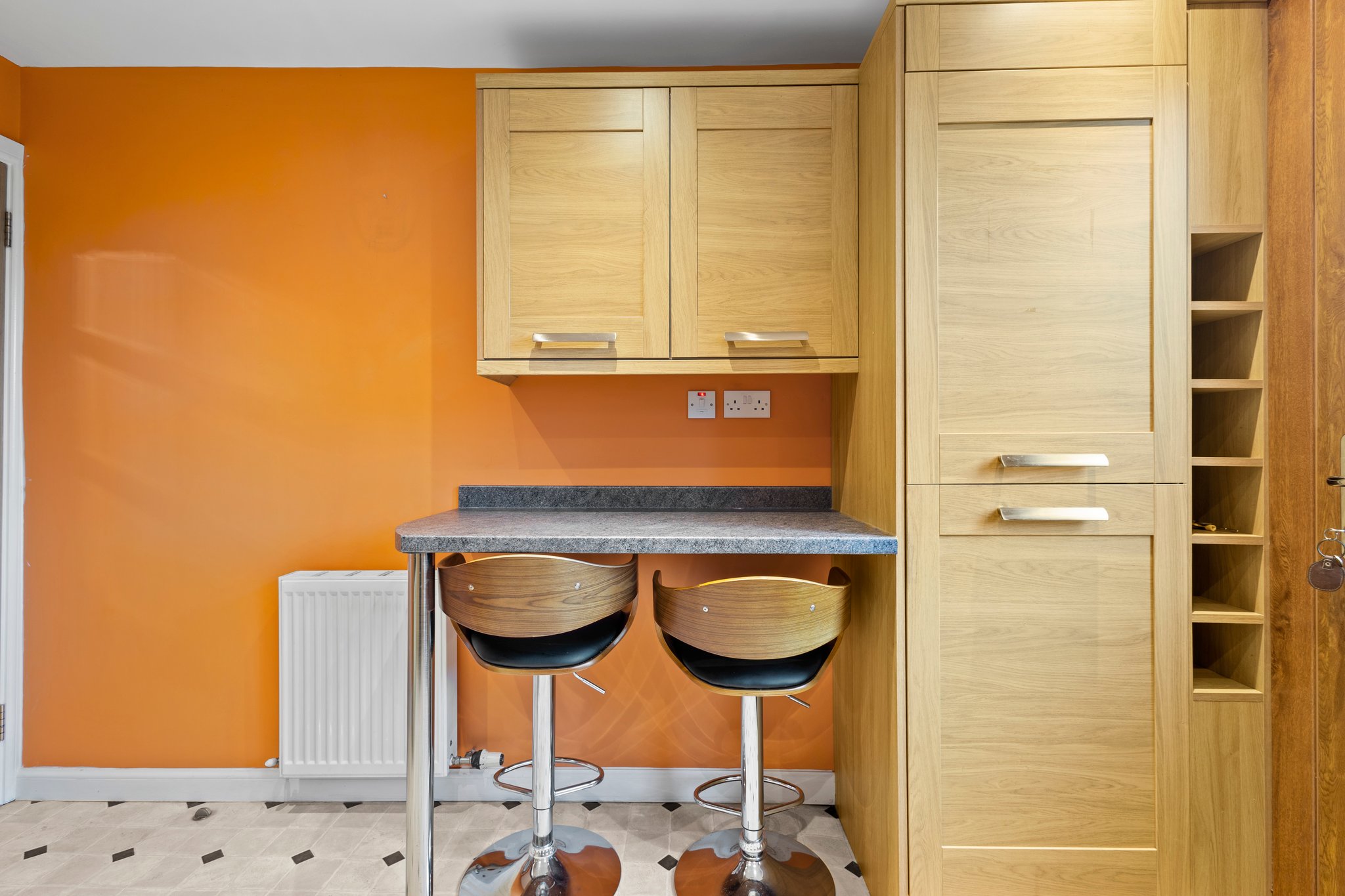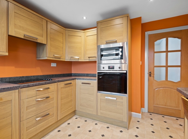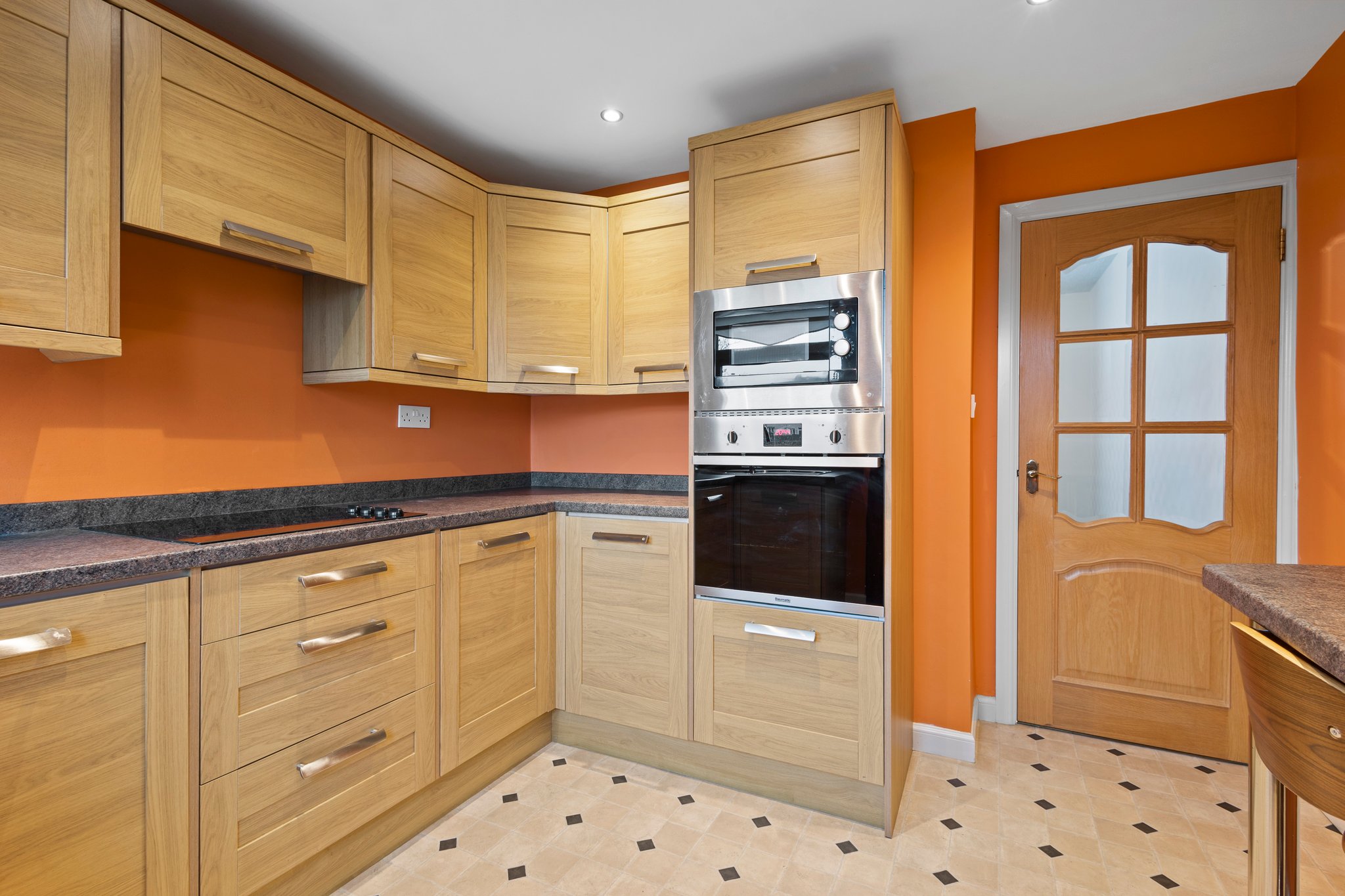 2.89m x 3.47m (9′ 6″ x 11′ 5″) Fully fitted kitchen complete with ample wall and base storage units with complimentary work surface, integrated oven, electric hob, microwave, washing machine and fridge freezer, neutral decor, breakfast bar seating area, ceiling spotlights, vinyl flooring and a double glazed window to the rear.