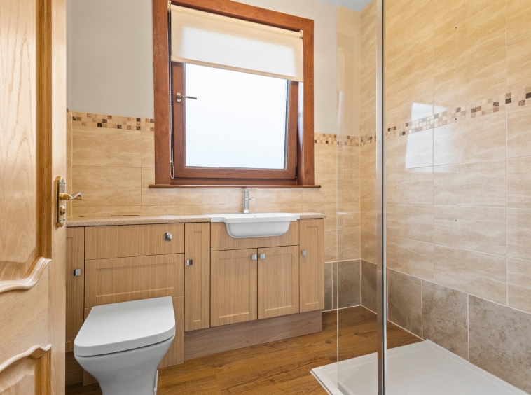 2.14m x 1.95m (7′ 0″ x 6′ 5″) Completing the accommodation is the family bathroom comprising of a wash hand basin with vanity storage, wc, shower cubicle with mains shower, neutral decor with stylish half height tiling, …. flooring and a double glazed window to the rear.