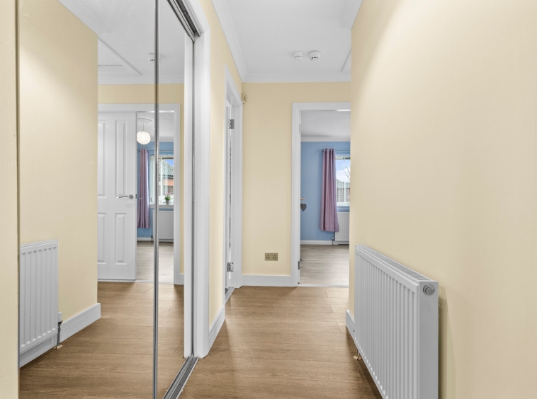 2.71m x 3.41m (8′ 11″ x 11′ 2″) Welcoming ‘L’ shaped hallway featuring modern decor, laminate flooring, convenient storage cupboard and gives access to all apartments.