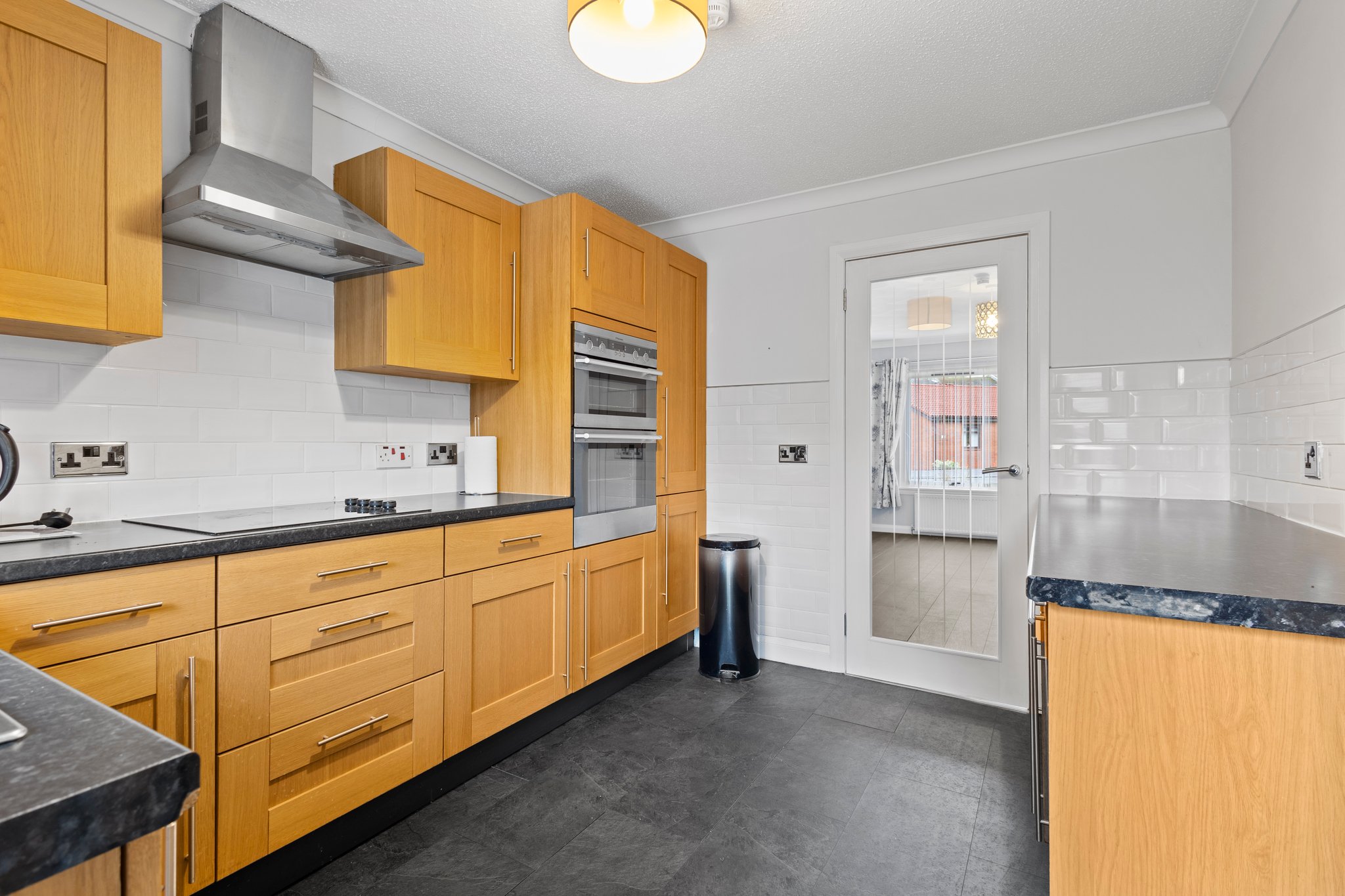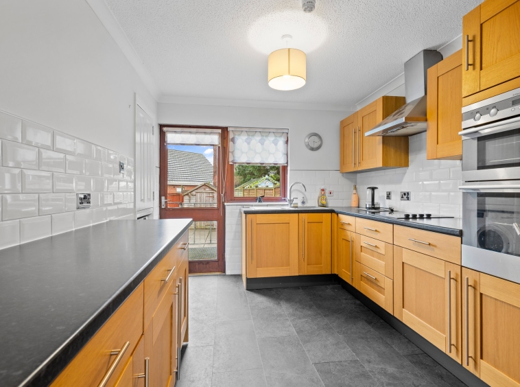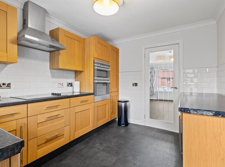 3.31m x 2.72m (10′ 10″ x 8′ 11″) Fully fitted kitchen offering an array of oak effect wall and base units, contrasting anthracite worksurfaces, integrated electric hob, oven, fridge freezer, space for washing machine and tumble drier, stainless steel sink and drainer, neutral decor, white metro style tiled splashback, click vinyl flooring, external door leading the rear garden and a double glazed window to the rear.