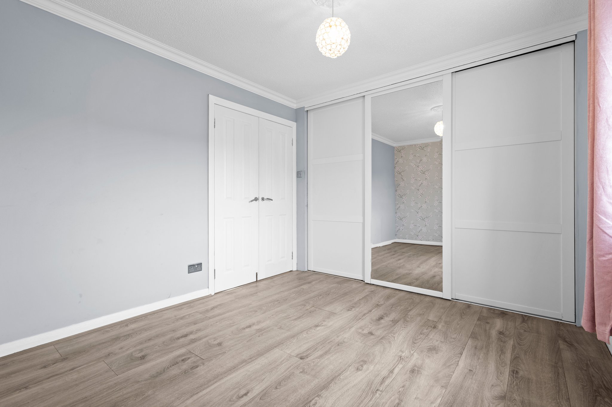 2.99m x 3.55m (9′ 10″ x 11′ 8″) Double bedroom featuring modern decor, laminate flooring, ceiling coving, triple fitted wardrobes and double glazed window to the front.
