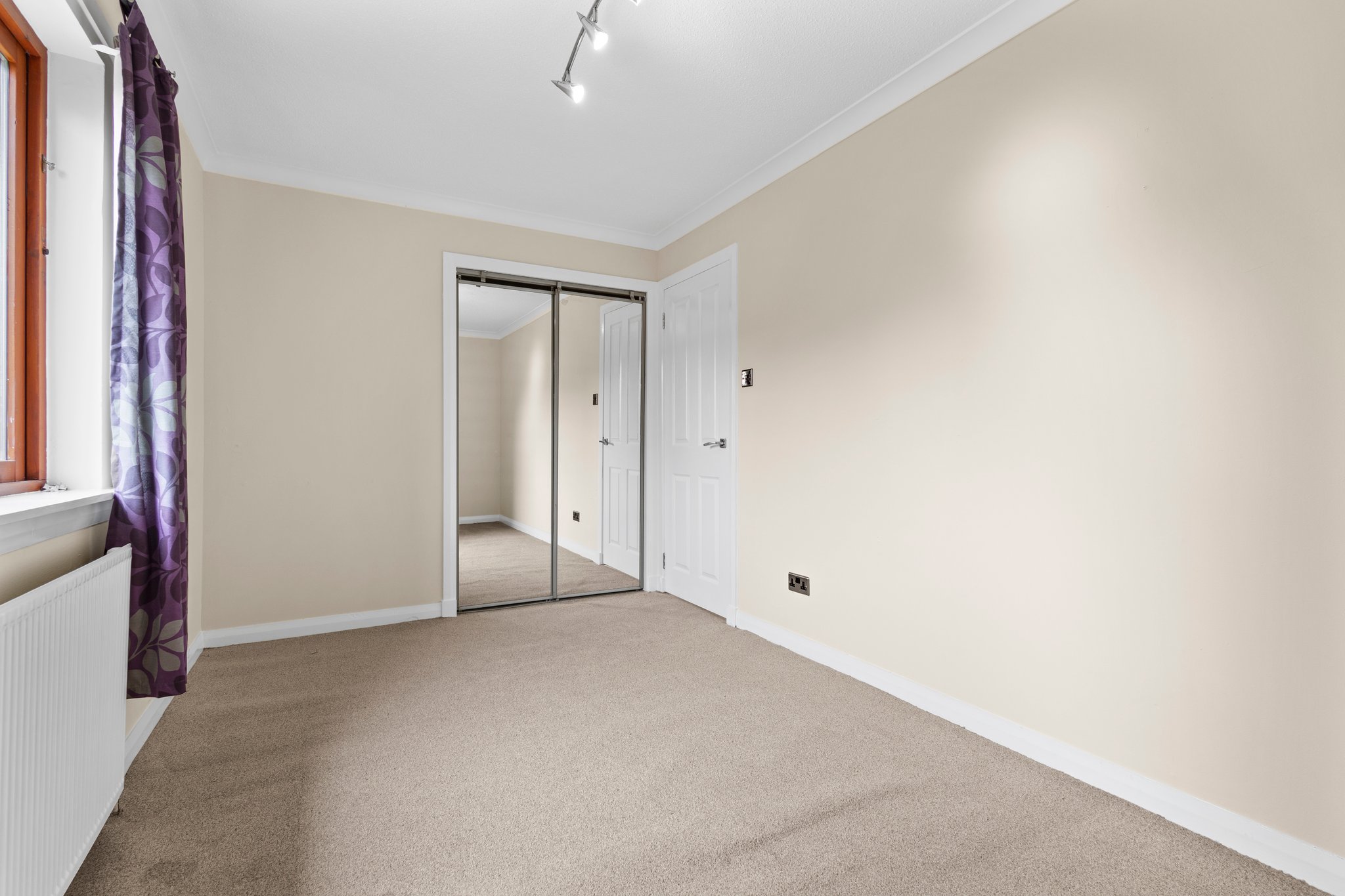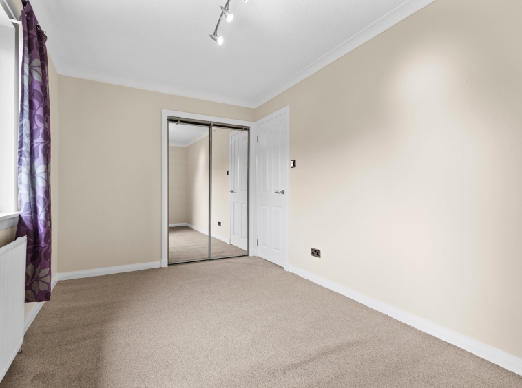 2.45m x 4.11m (8′ 0″ x 13′ 6″) Double bedroom featuring modern decor, fitted carpet, ceiling coving, double fitted wardrobes and a double glazed window to the rear.
