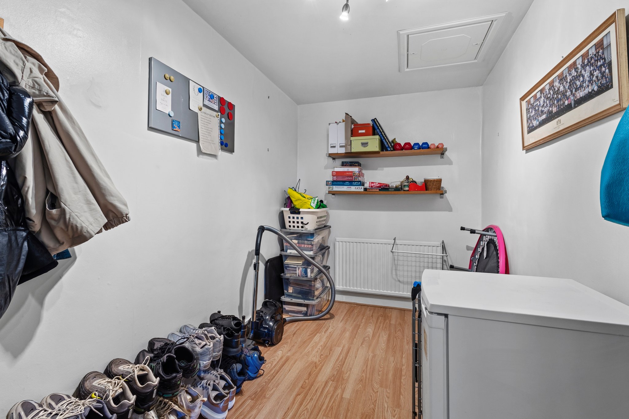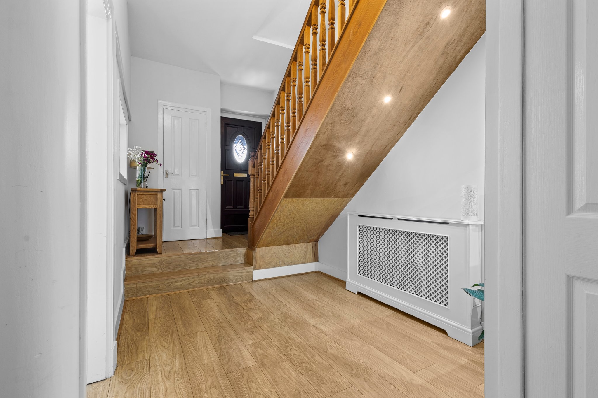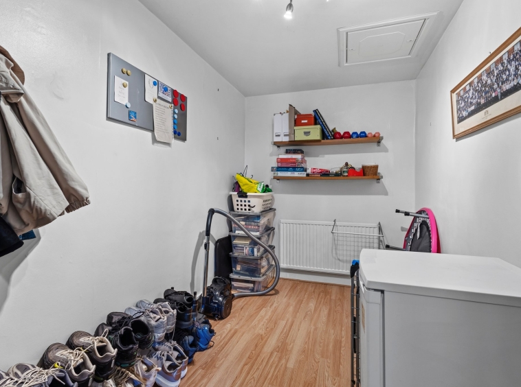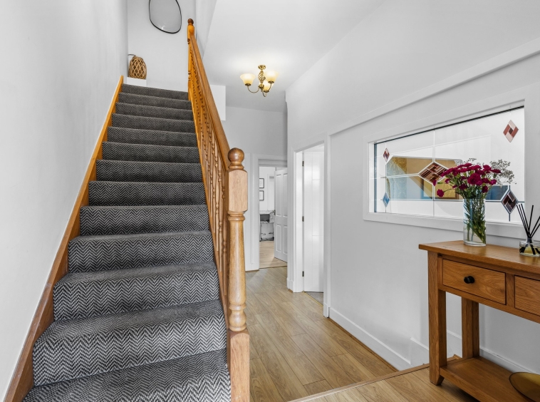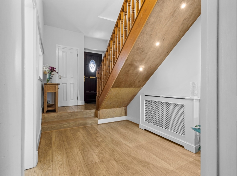 2.33m x 5.33m (7′ 8″ x 17′ 6″) Access is given to a welcoming grand, spacious hallway offering neutral decor, traditional high ceiling, two practical storage cupboards and laminate flooring. The hallway gives access to the lounge, kitchen and office and a a stunning oak and carpeted staircase leads to the upper level.