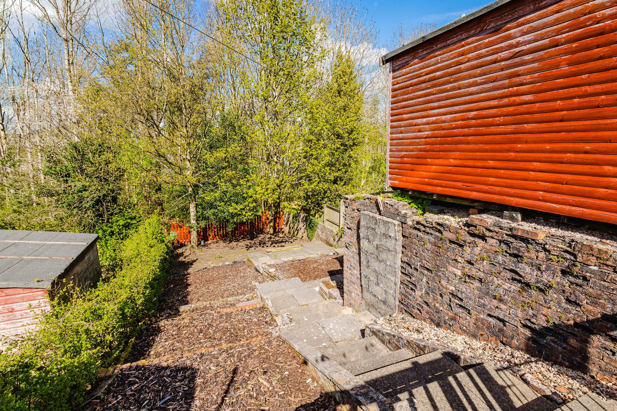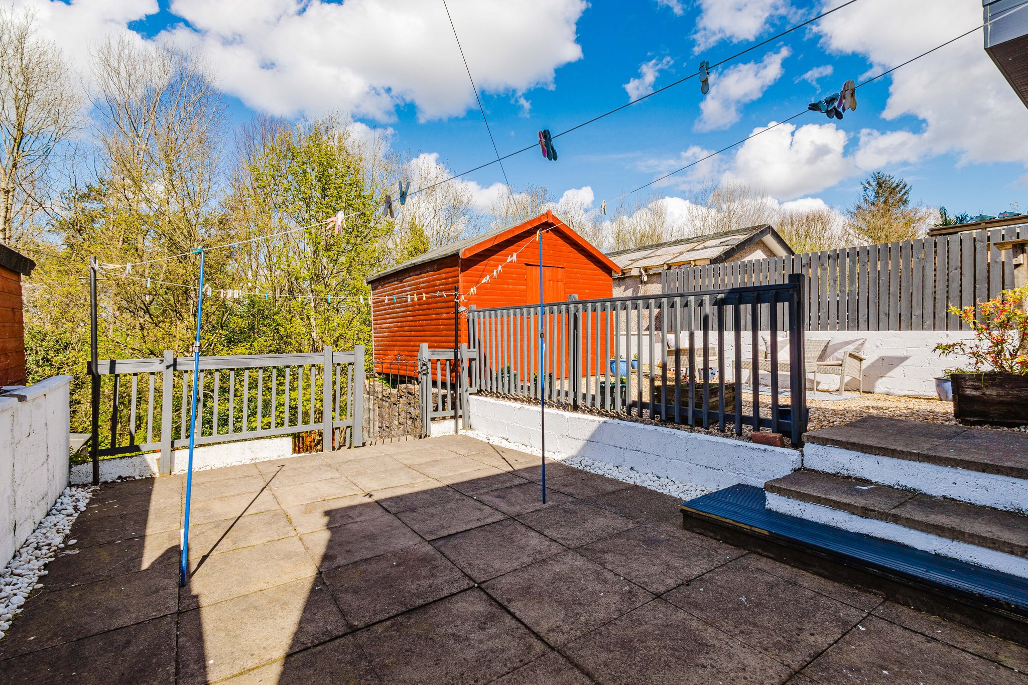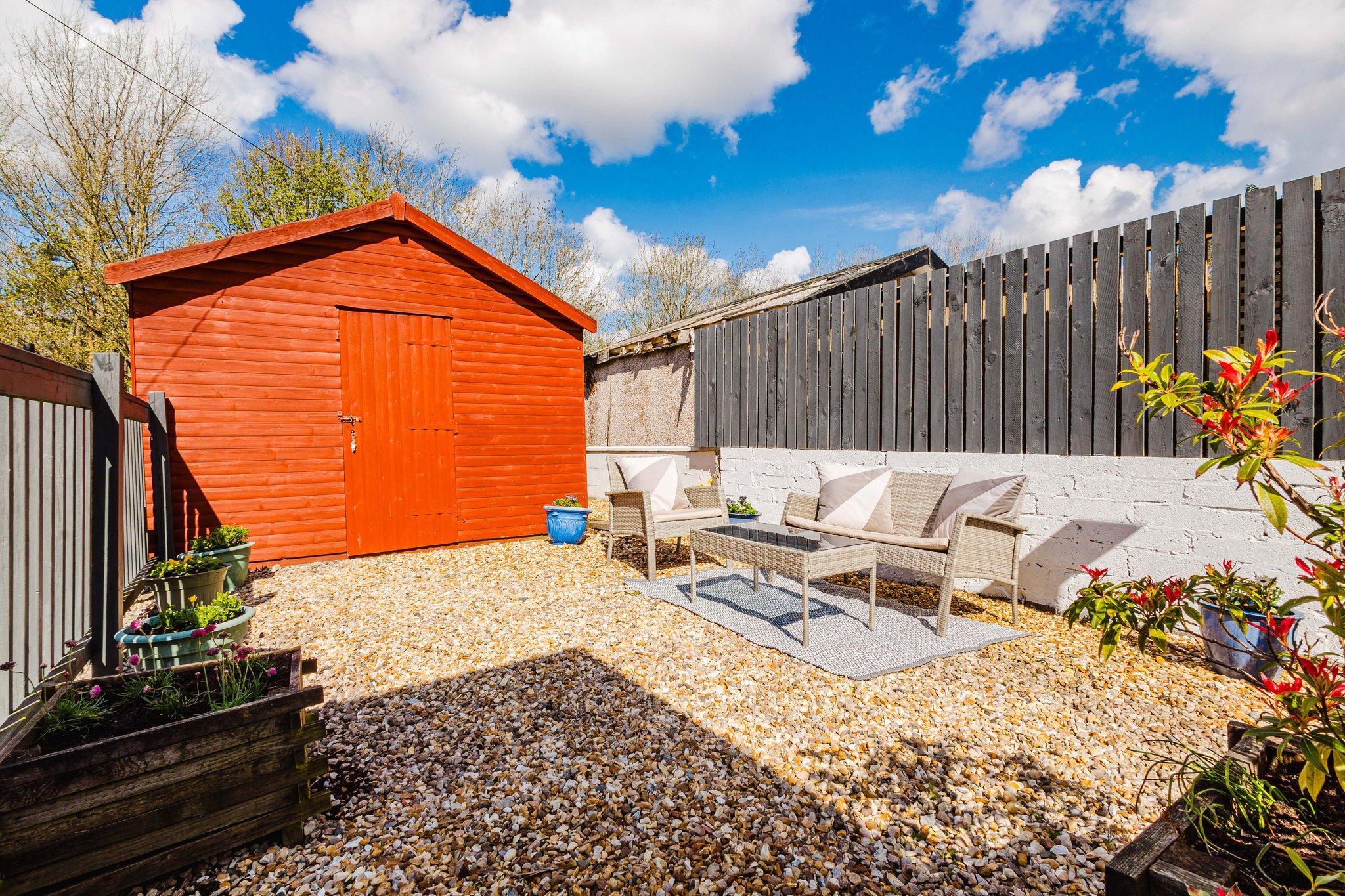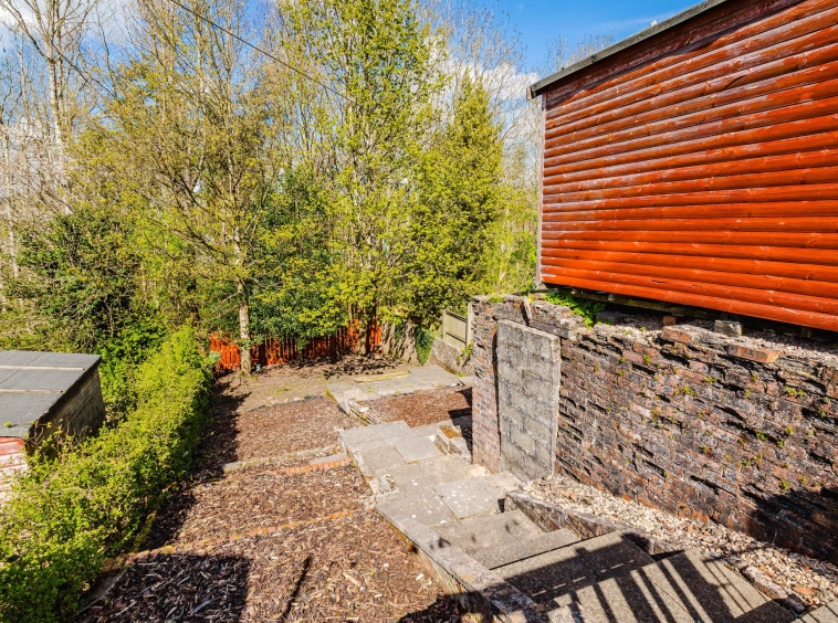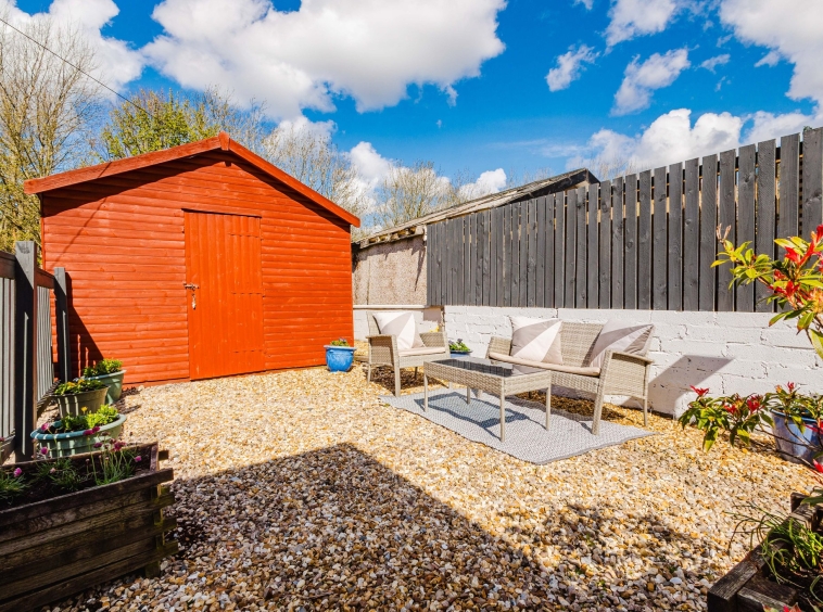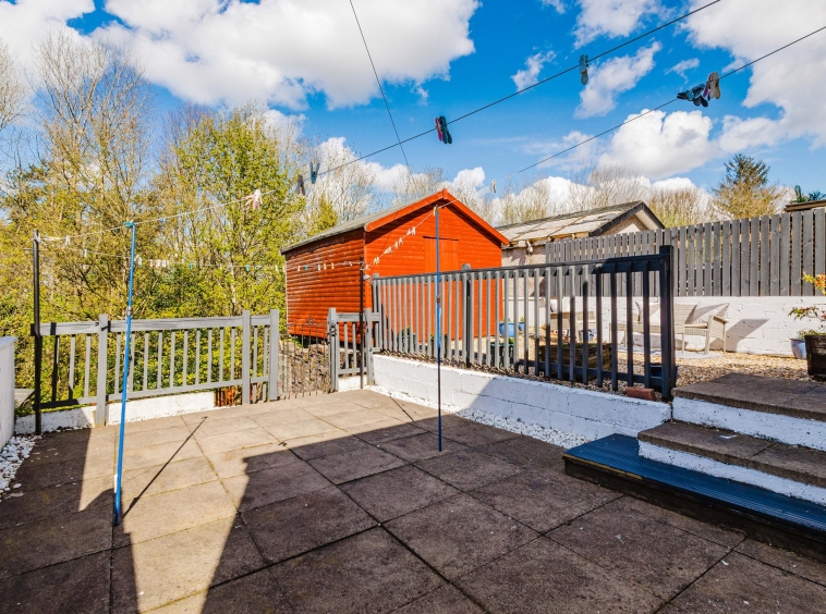 The main garden features an attractive chipped seating area, along with a paved patio and designated drying space. Steps then lead down to a tiered bedding area, ideal for gardening enthusiasts or those wishing to create their own allotment-style space.