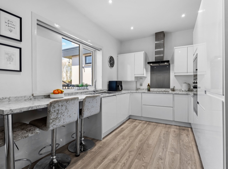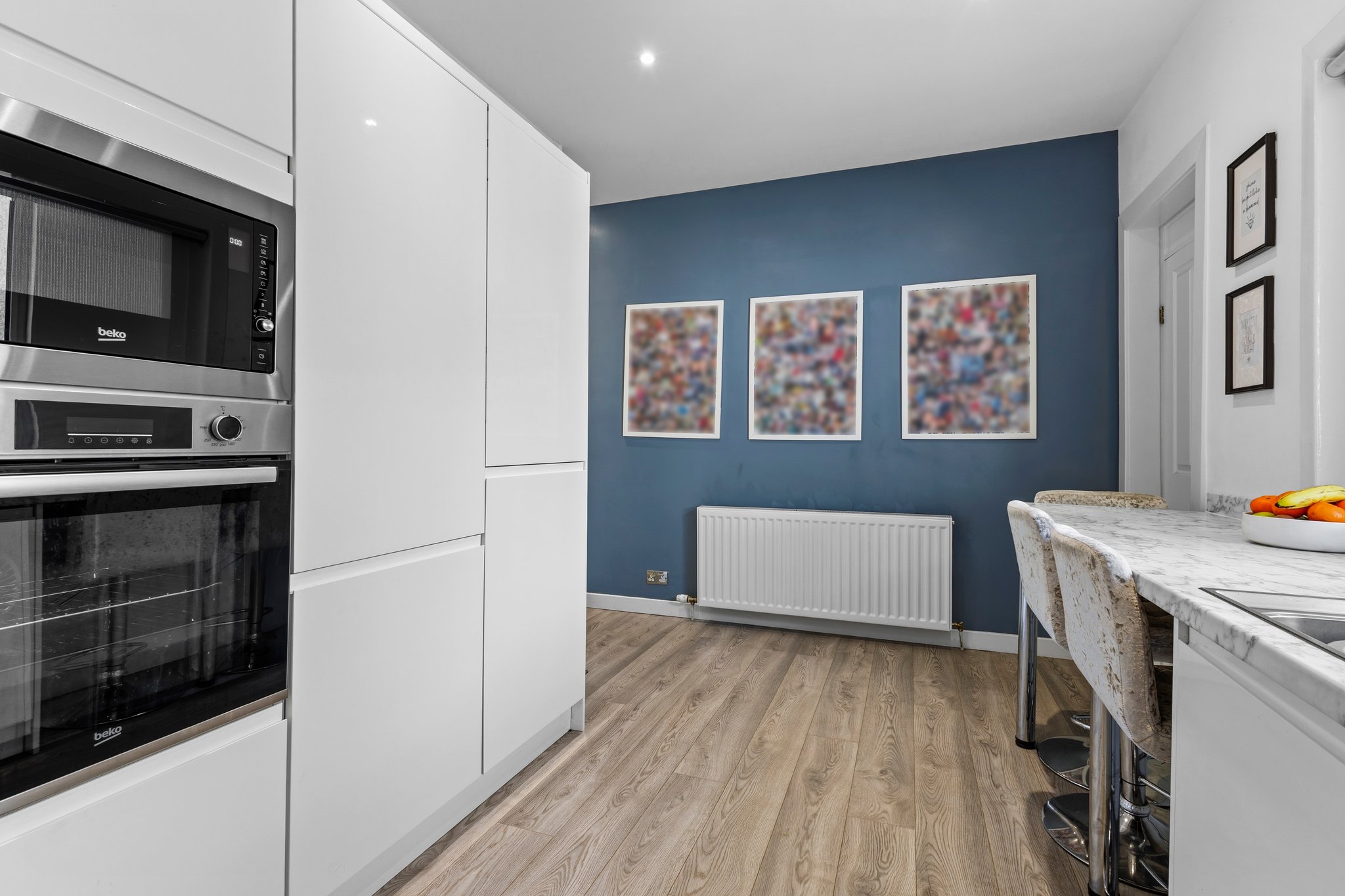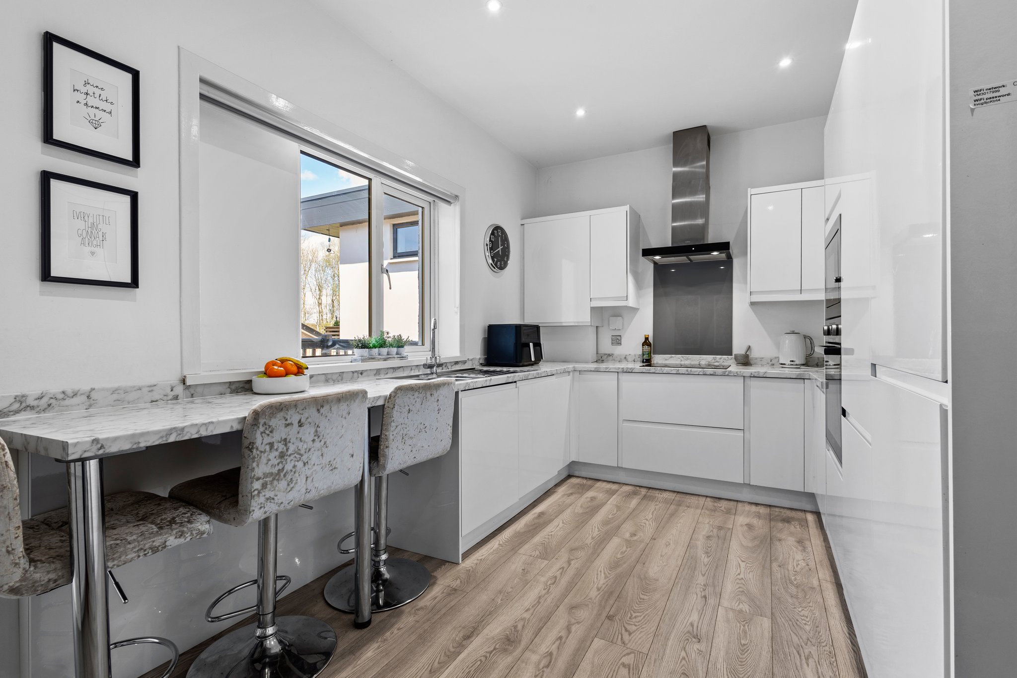 4.63m x 3.75m (15′ 2″ x 12′ 4″) Fully fitted kitchen complete with ample wall and base storage units, complimentary work surface, integrated oven, electric hob, microwave, fridge freezer and washing machine, stainless steel sink and drainer, modern decor, breakfast bar seating area, ceiling spotlights, laminate flooring and a double glazed window to the rear.