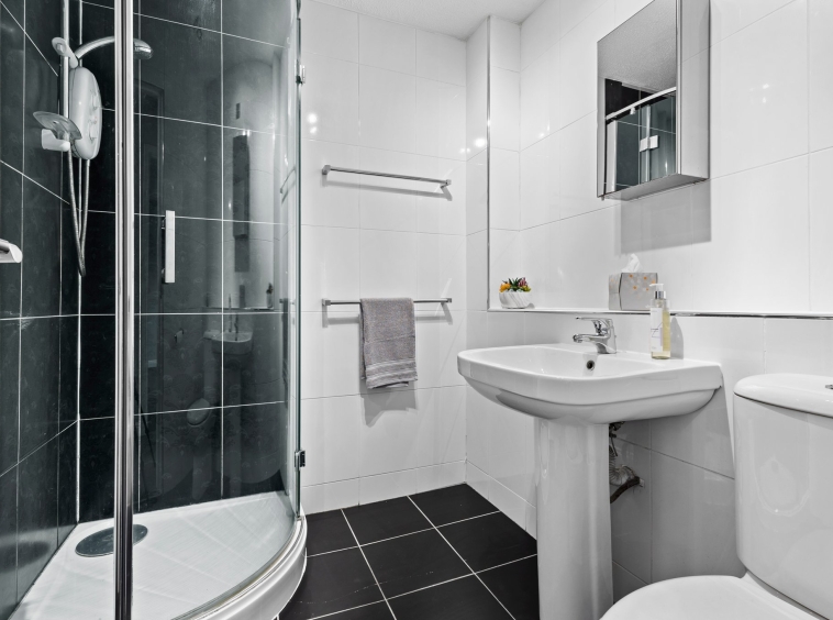 1.72m x 1.90m (5′ 8″ x 6′ 3″) Completing the accommodation is the stylish bathroom comprising of a wash hand basin, wc, large corner shower cubicle with electric shower, fully modern tiled finish and tiled flooring.