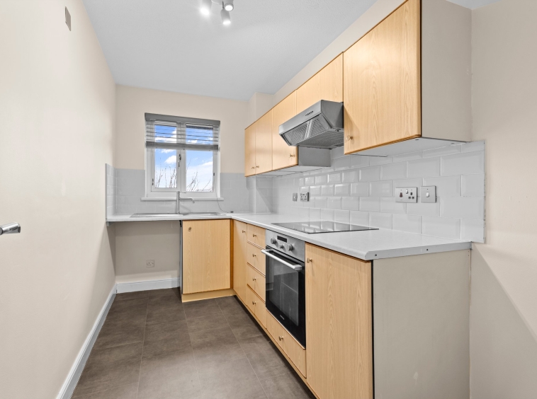 3.43m x 1.76m (11′ 3″ x 5′ 9″) Fully fitted kitchen complete with ample wall and base storage units, complimentary work surface, integrated oven, electric hob, plumbing and space for a washing machine and fridge freezer, stainless steel sink and drainer, neutral decor, vinyl flooring and a double glazed window to the front.