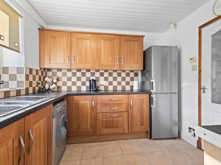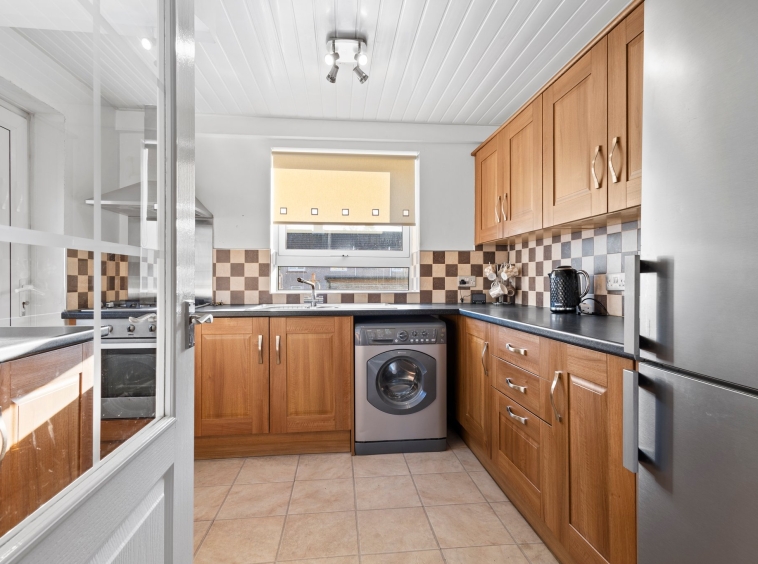 2.99m x 2.91m (9′ 10″ x 9′ 7″) Fully fitted kitchen complete with ample wall and base storage units, integrated oven, hob and hood, plumbing and space for washing machine and fridge freezer, stainless steel sink and drainer, neutral decor, tiled flooring, double glazed window to the rear and a door to the rear garden.